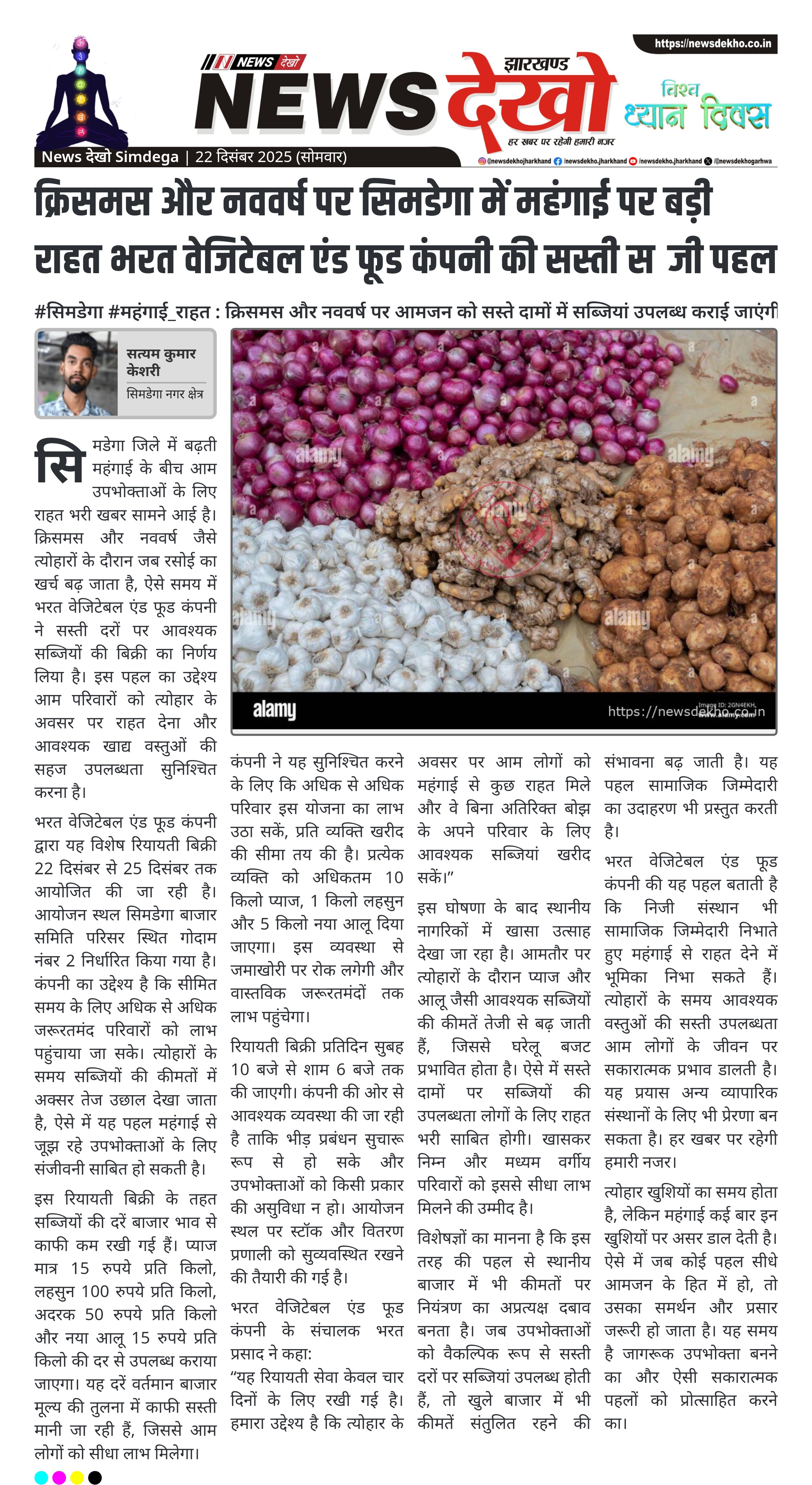 क्रिसमस और नववर्ष पर सिमडेगा में महंगाई पर बड़ी राहत भरत वेजिटेबल एंड फूड कंपनी की सस्ती सब्जी पहल