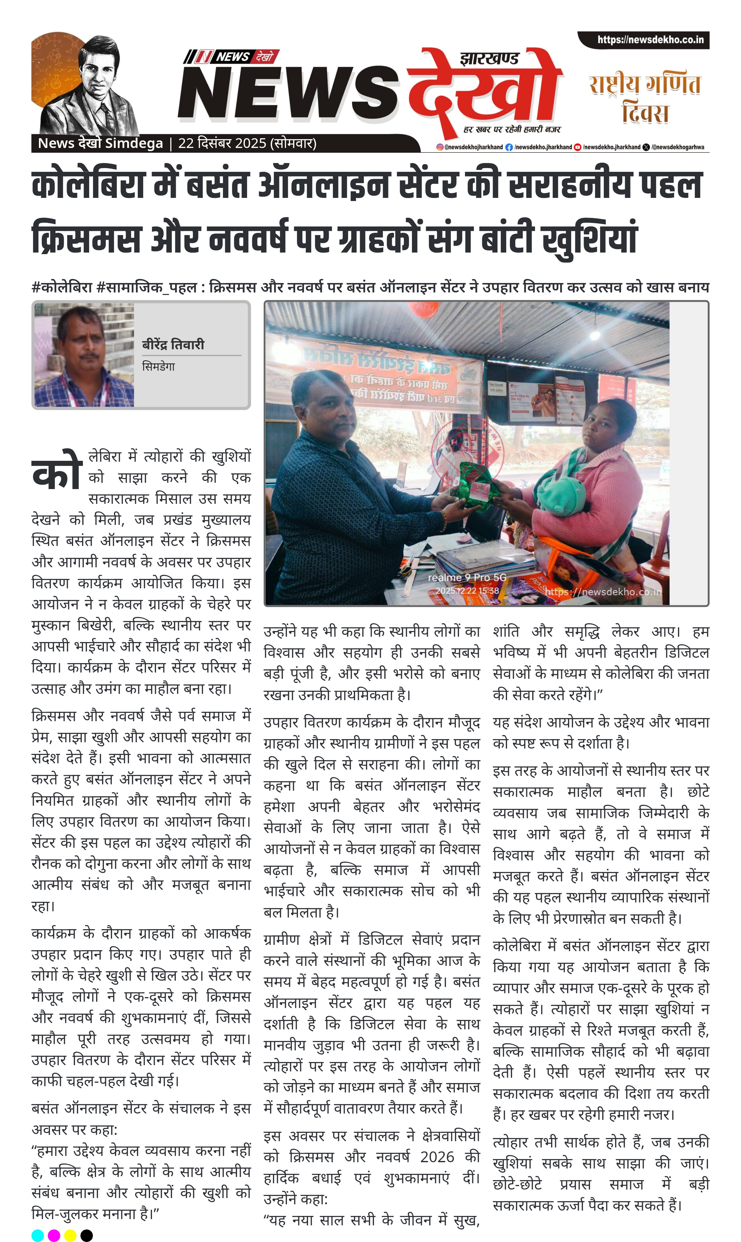 #कोलेबिरा #सामाजिक_पहल : क्रिसमस और नववर्ष पर बसंत ऑनलाइन सेंटर ने उपहार वितरण कर उत्सव को खास बनाया। कोलेबिरा प्रखंड मुख्यालय में आयोजित हुआ विशेष कार्यक्रम। बसंत ऑनलाइन सेंटर ने ग्राहकों के बीच बांटे उपहार। क्रिसमस और नववर्ष 2026 के उपलक्ष्य में आयोजन। स्थानीय ग्राहकों और ग्रामीणों की रही सक्रिय…
