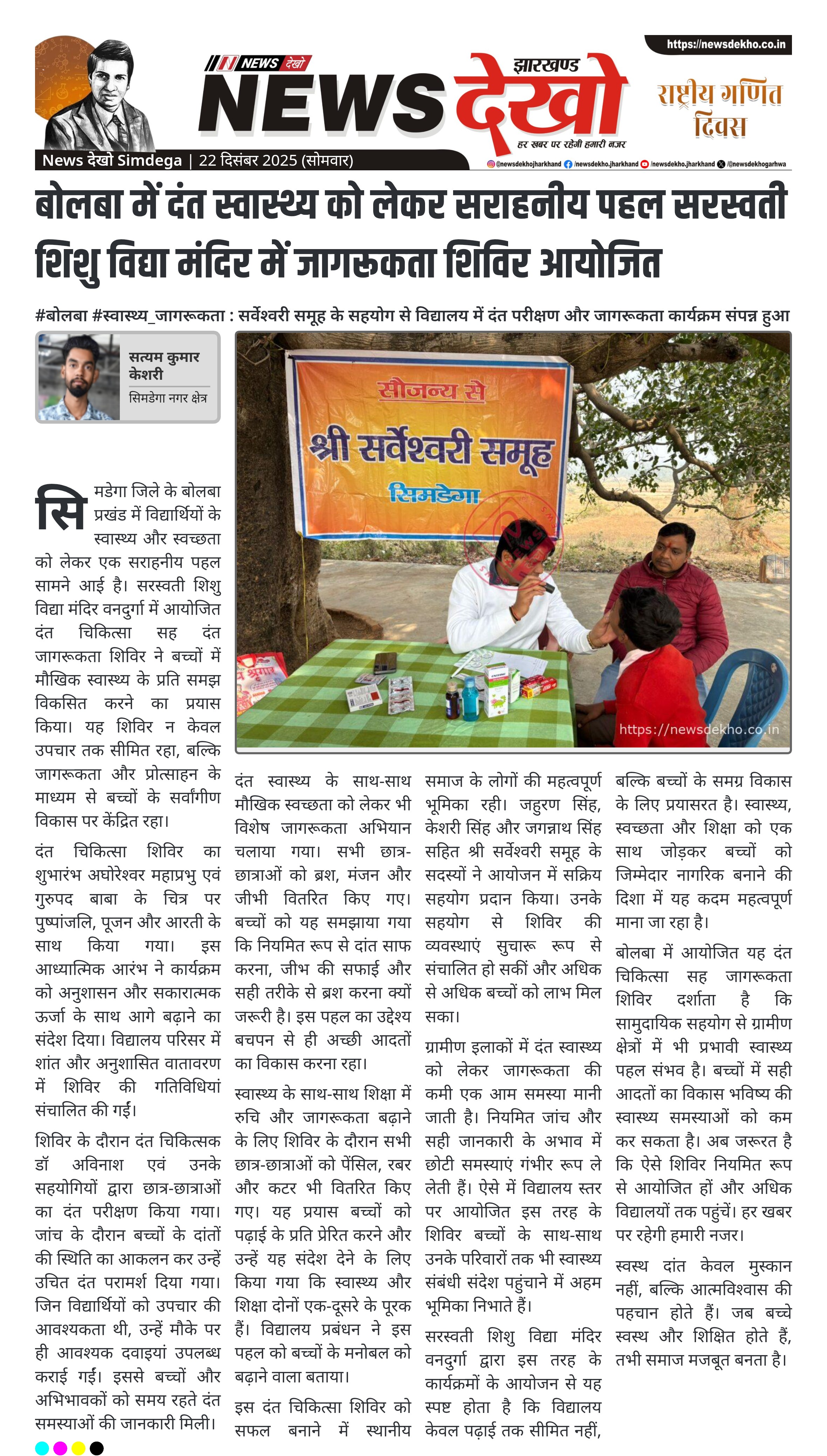 #बोलबा #स्वास्थ्य_जागरूकता : सर्वेश्वरी समूह के सहयोग से विद्यालय में दंत परीक्षण और जागरूकता कार्यक्रम संपन्न हुआ। सरस्वती शिशु विद्या मंदिर वनदुर्गा में दंत शिविर का आयोजन। श्री सर्वेश्वरी समूह शाखा सिमडेगा के तत्वावधान में कार्यक्रम। दंत चिकित्सक डॉ अविनाश ने किया दंत परीक्षण। ब्रश, मंजन और जीभी का वितरण।…