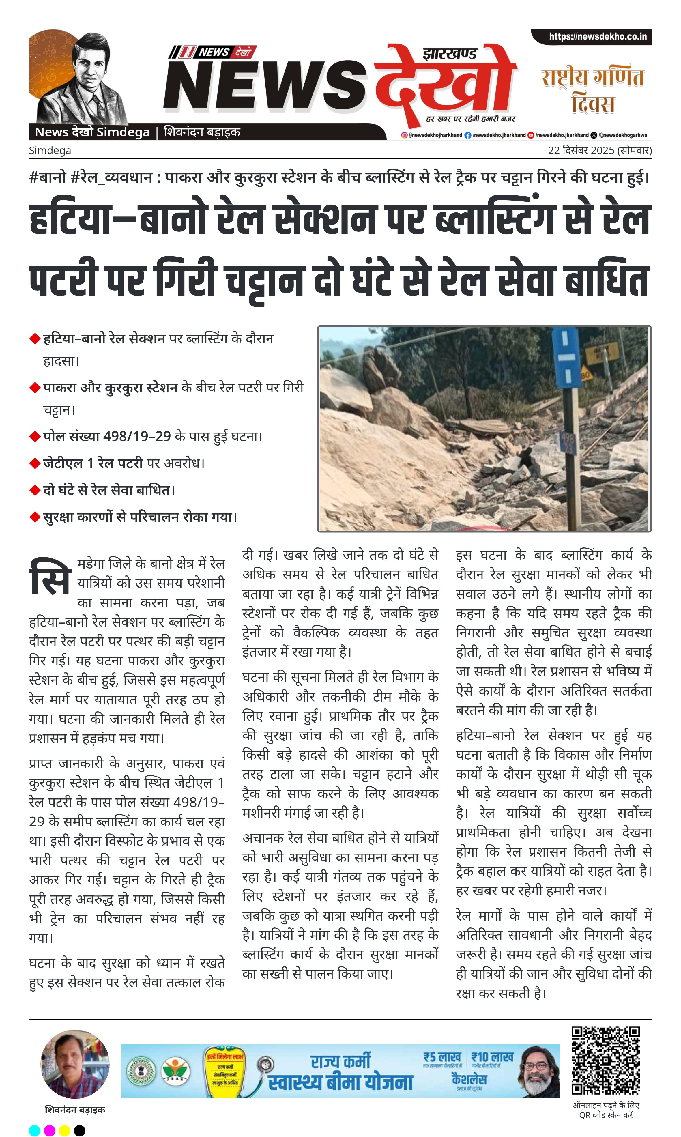 #बानो #रेल_व्यवधान : पाकरा और कुरकुरा स्टेशन के बीच ब्लास्टिंग से रेल ट्रैक पर चट्टान गिरने की घटना हुई। हटिया–बानो रेल सेक्शन पर ब्लास्टिंग के दौरान हादसा। पाकरा और कुरकुरा स्टेशन के बीच रेल पटरी पर गिरी चट्टान। पोल संख्या 498/19–29 के पास हुई घटना। जेटीएल 1 रेल पटरी पर…