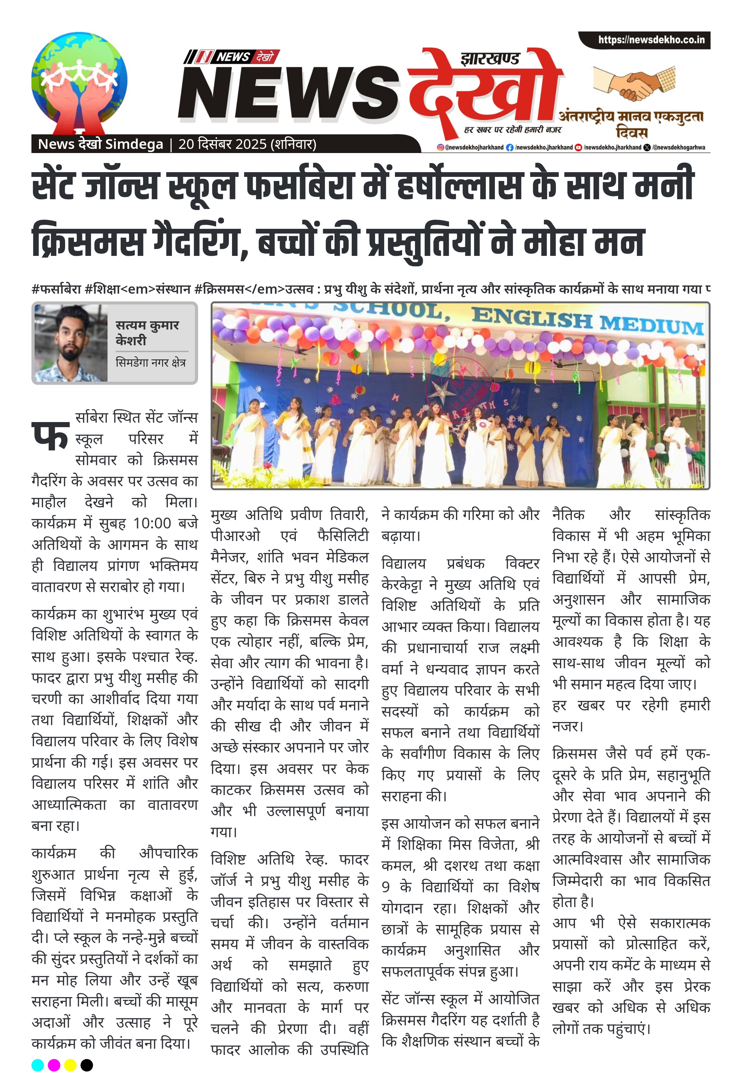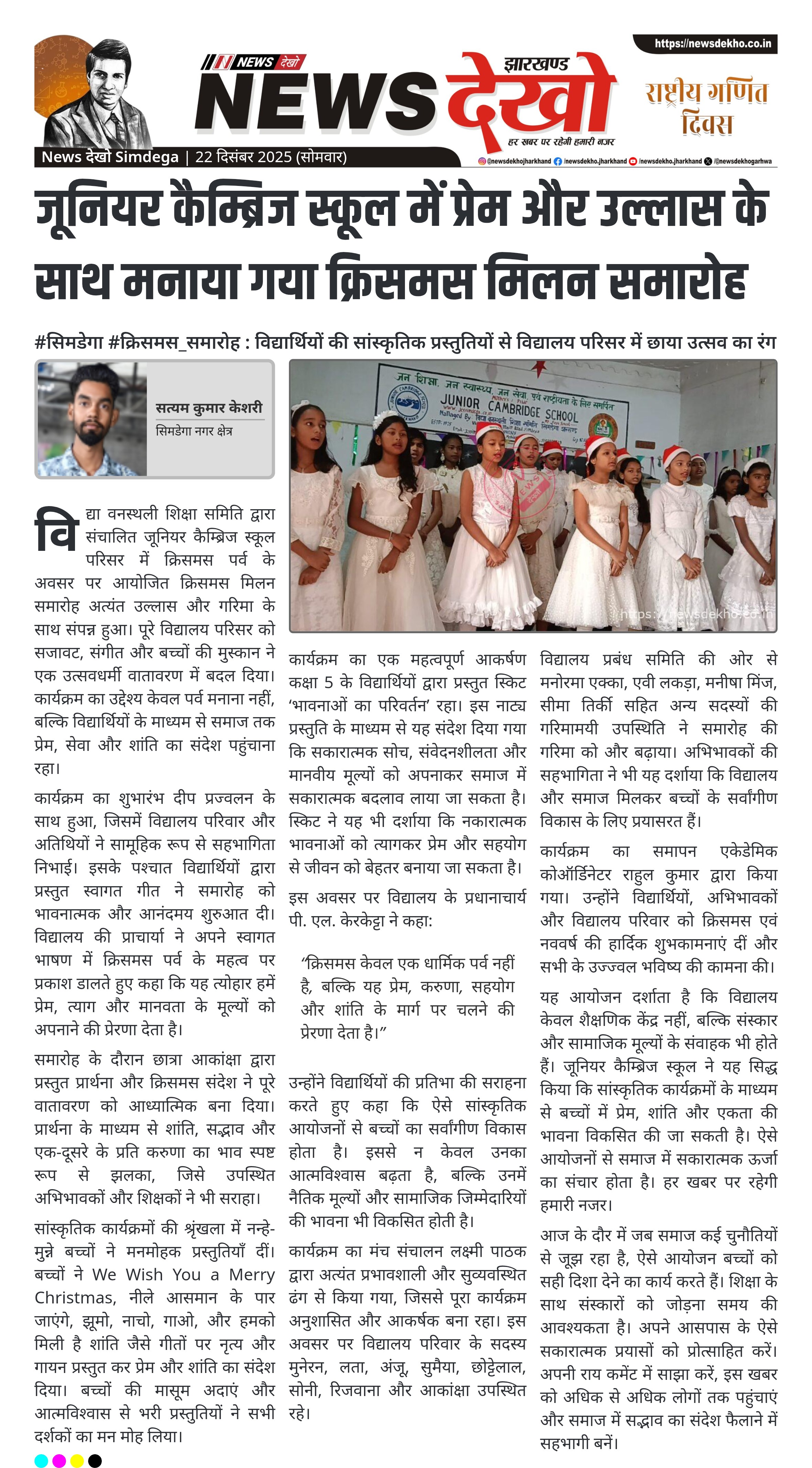 #सिमडेगा #क्रिसमस_समारोह : विद्यार्थियों की सांस्कृतिक प्रस्तुतियों से विद्यालय परिसर में छाया उत्सव का रंग। जूनियर कैम्ब्रिज स्कूल, सिमडेगा में क्रिसमस मिलन समारोह का आयोजन। विद्या वनस्थली शिक्षा समिति के तत्वावधान में हुआ कार्यक्रम। विद्यार्थियों ने गीत, नृत्य और स्किट के माध्यम से प्रेम और शांति का संदेश दिया। प्रधानाचार्य…