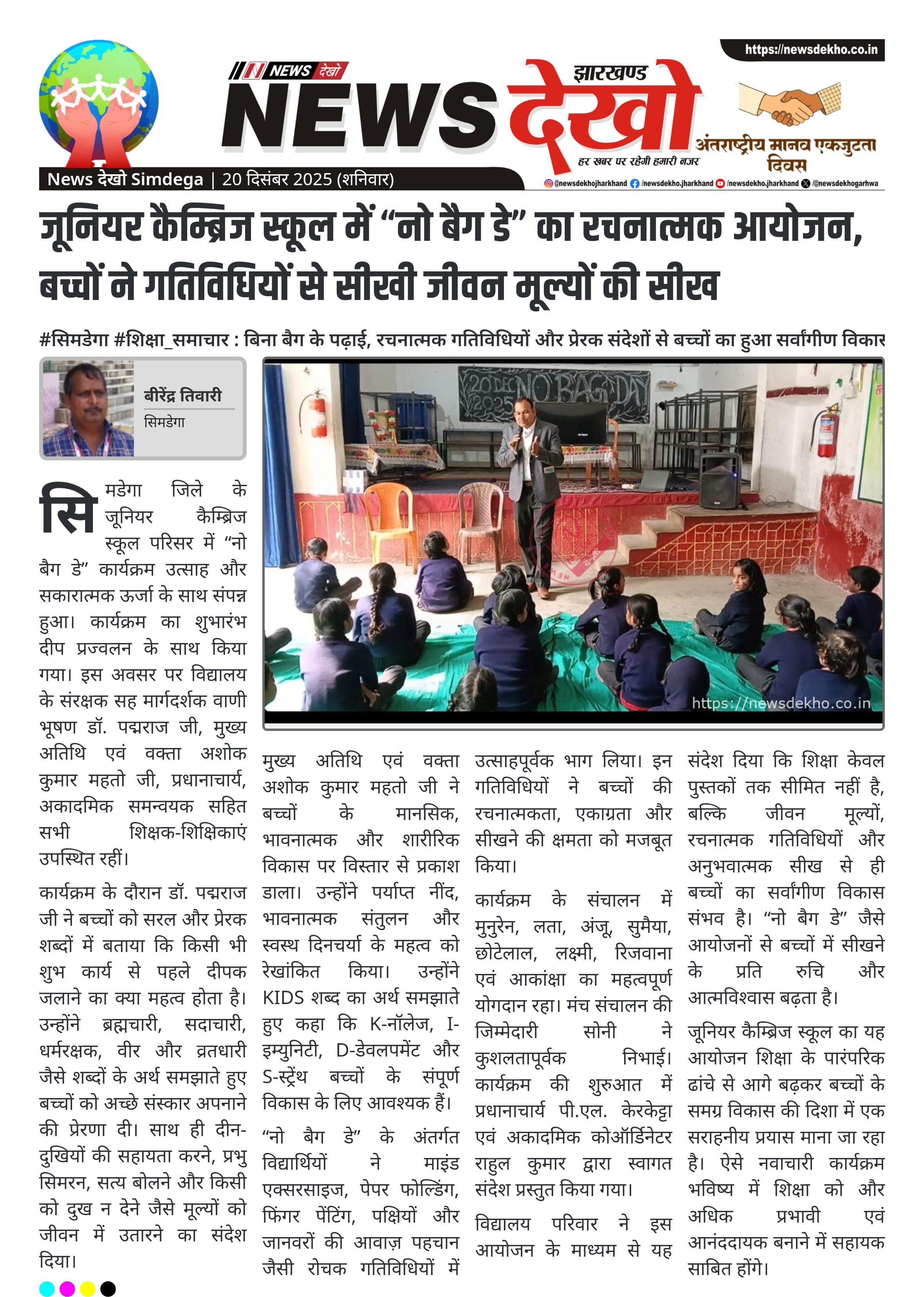 #सिमडेगा #शिक्षा_समाचार : बिना बैग के पढ़ाई, रचनात्मक गतिविधियों और प्रेरक संदेशों से बच्चों का हुआ सर्वांगीण विकास। जूनियर कैम्ब्रिज स्कूल में “नो बैग डे” का आयोजन दीप प्रज्वलन के साथ कार्यक्रम की हुई शुरुआत शिक्षाविदों ने बच्चों को दिए संस्कार और जीवन मूल्यों के संदेश रचनात्मक गतिविधियों से बच्चों…