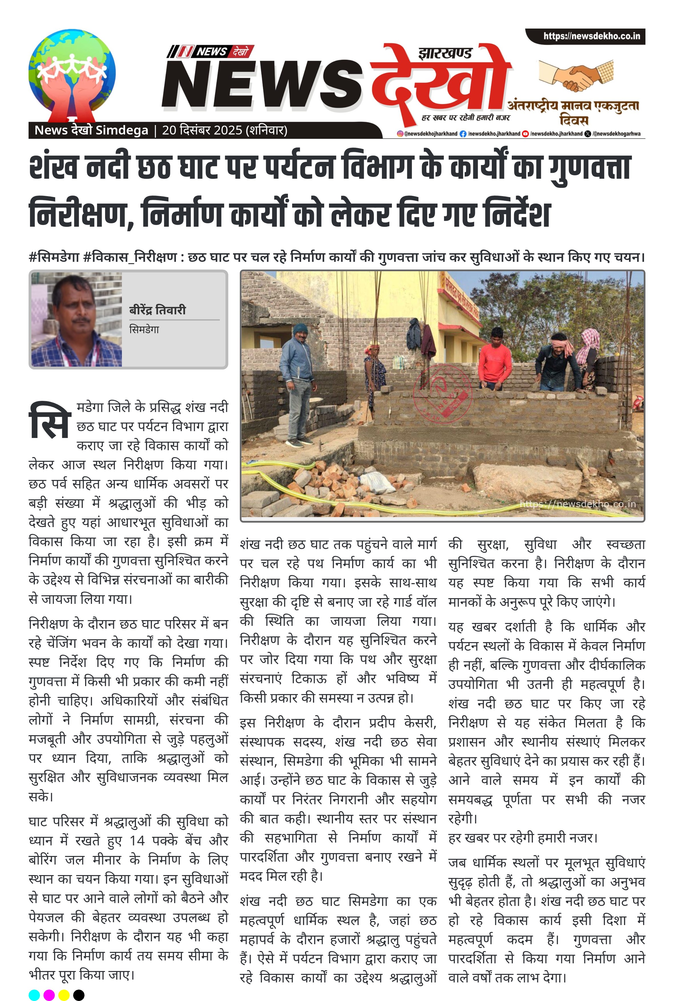 #सिमडेगा #विकास_निरीक्षण : छठ घाट पर चल रहे निर्माण कार्यों की गुणवत्ता जांच कर सुविधाओं के स्थान किए गए चयन। शंख नदी छठ घाट, सिमडेगा में पर्यटन विभाग के कार्यों का निरीक्षण। चेंजिंग भवन निर्माण की गुणवत्ता की जांच। 14 पक्के बेंच और बोरिंग जल मीनार के लिए स्थान चयन।…