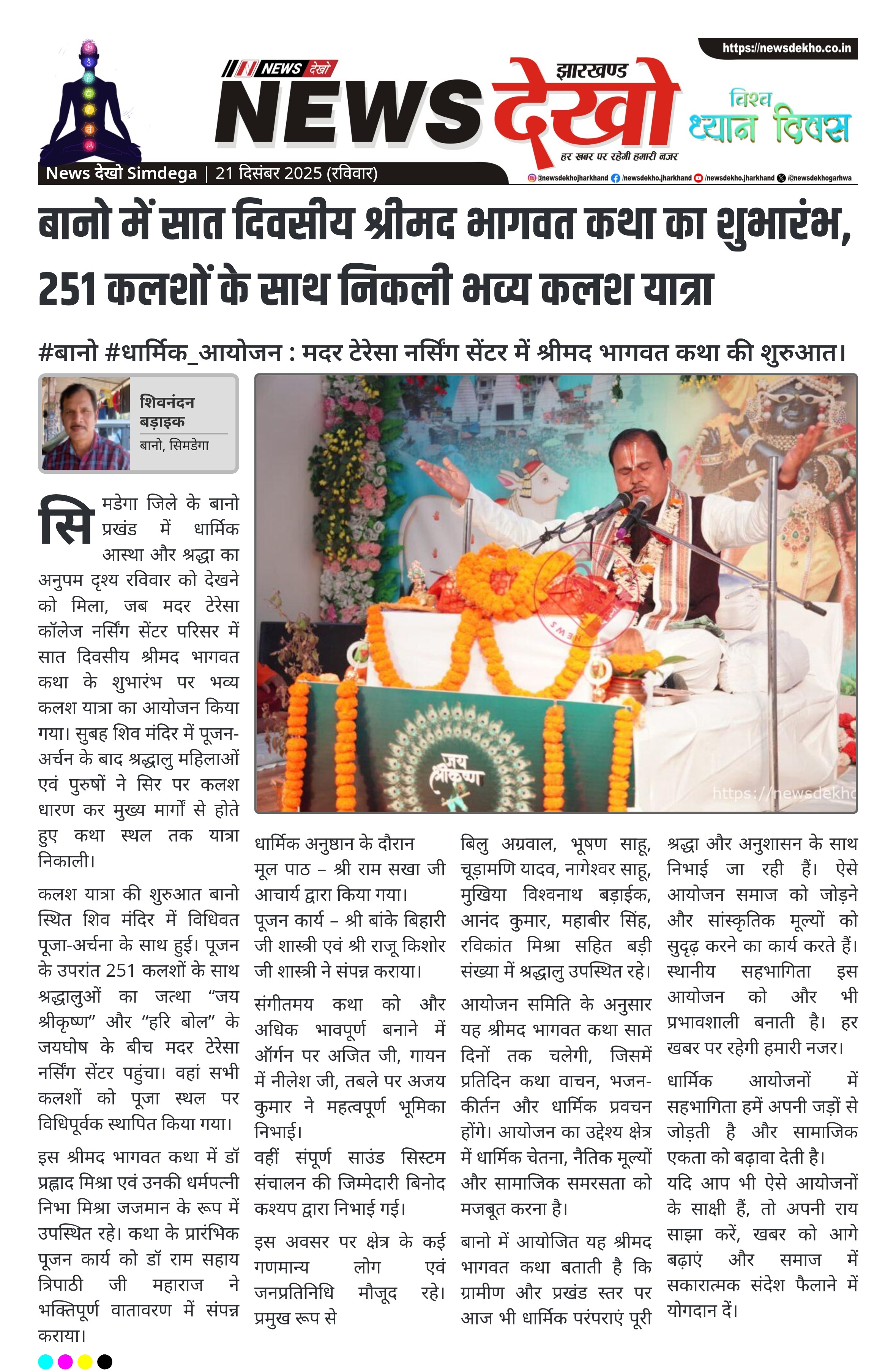 #बानो #धार्मिक_आयोजन : मदर टेरेसा नर्सिंग सेंटर में श्रीमद भागवत कथा की शुरुआत। बानो प्रखंड मुख्यालय में सात दिवसीय श्रीमद भागवत कथा का आयोजन। 251 कलशों के साथ शिव मंदिर से निकली भव्य कलश यात्रा। डॉ प्रह्लाद मिश्रा व निभा मिश्रा बने कथा के जजमान। डॉ राम सहाय त्रिपाठी जी…