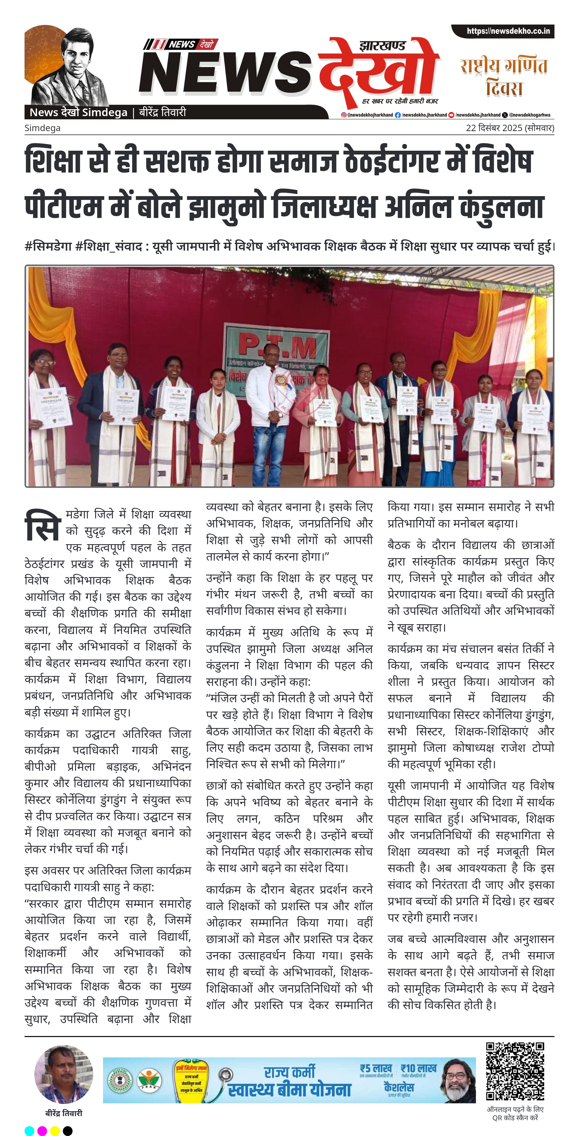 #सिमडेगा #शिक्षा_संवाद : यूसी जामपानी में विशेष अभिभावक शिक्षक बैठक में शिक्षा सुधार पर व्यापक चर्चा हुई। यूसी जामपानी ठेठईटांगर में विशेष पीटीएम का आयोजन। अतिरिक्त जिला कार्यक्रम पदाधिकारी गायत्री साहु ने रखे शिक्षा सुधार के उद्देश्य। झामुमो जिलाध्यक्ष अनिल कंडुलना ने छात्रों को दिया प्रेरक संदेश। शिक्षक, छात्र और…