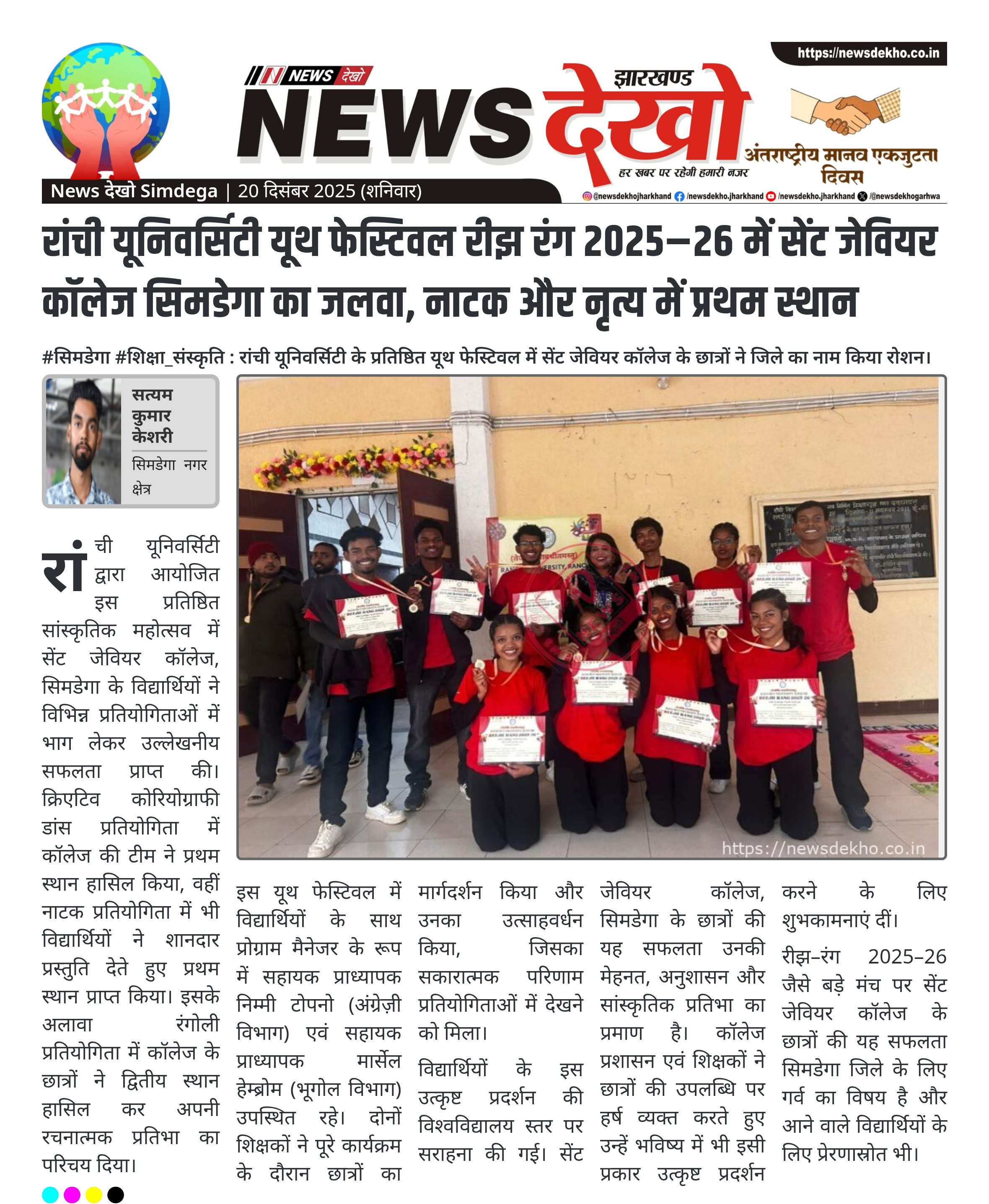 रांची यूनिवर्सिटी यूथ फेस्टिवल रीझ रंग 2025–26 में सेंट जेवियर कॉलेज सिमडेगा का जलवा, नाटक और नृत्य में प्रथम स्थान