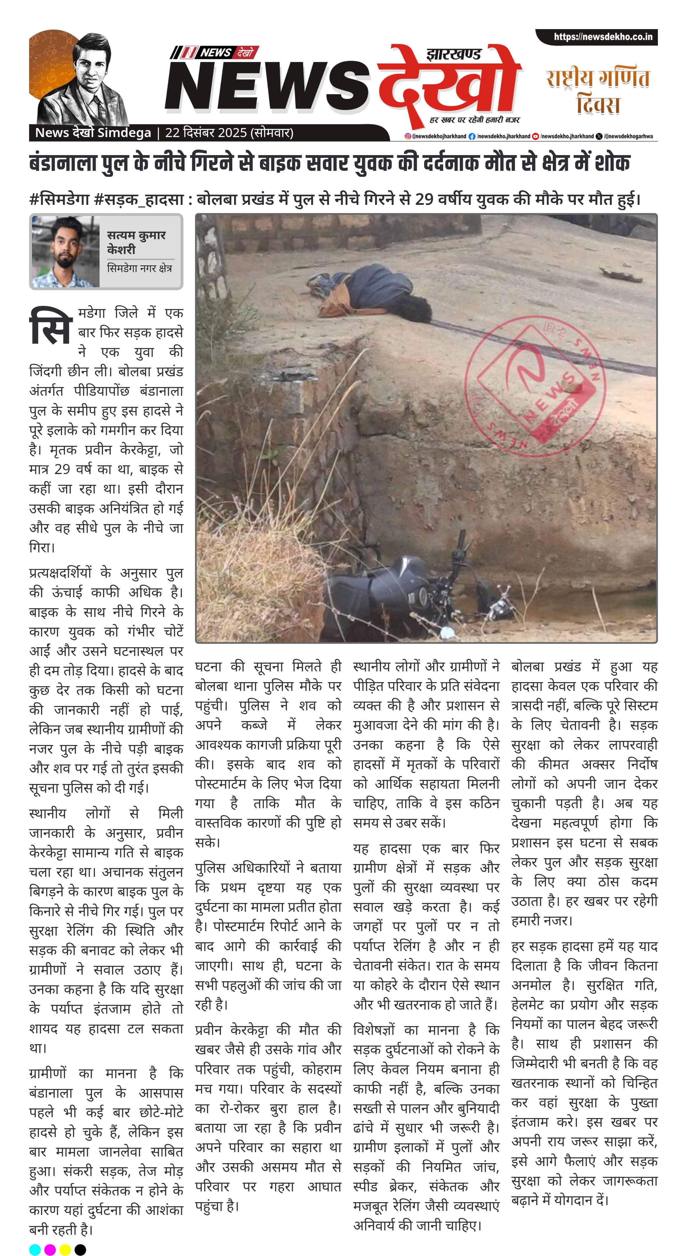 #सिमडेगा #सड़क_हादसा : बोलबा प्रखंड में पुल से नीचे गिरने से 29 वर्षीय युवक की मौके पर मौत हुई। बोलबा प्रखंड के पीडियापोंछ बंडानाला पुल के पास हादसा। मृतक की पहचान प्रवीन केरकेट्टा (29 वर्ष) के रूप में। बाइक अनियंत्रित होकर पुल के नीचे जा गिरी। गंभीर चोट लगने से…
