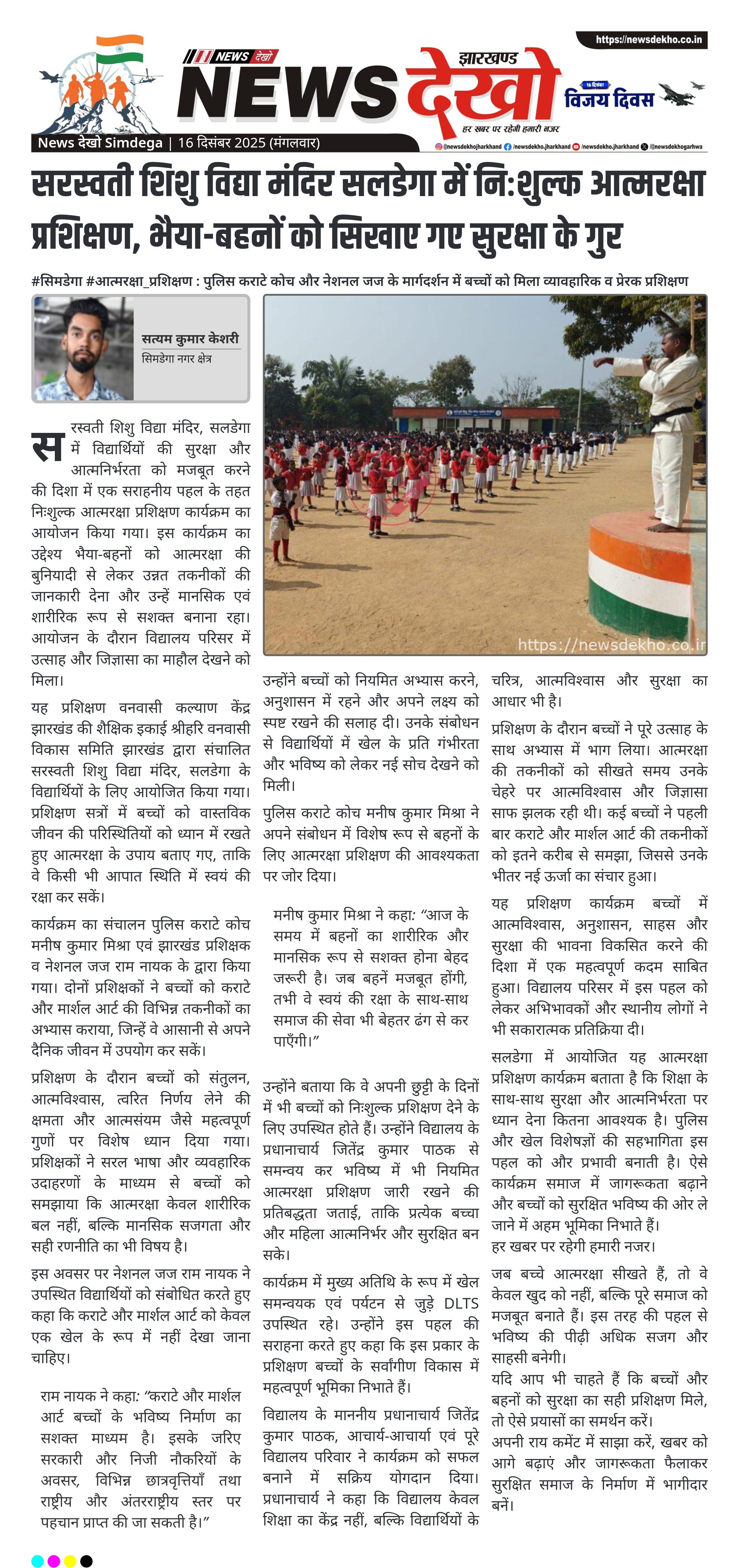 #सिमडेगा #आत्मरक्षा_प्रशिक्षण : सरस्वती शिशु विद्या मंदिर सलडेगा में पुलिस कराटे कोच और नेशनल जज के मार्गदर्शन में भैया बहनों को व्यावहारिक आत्मरक्षा का निःशुल्क प्रशिक्षण दिया गया सरस्वती शिशु विद्या मंदिर सलडेगा में निःशुल्क आत्मरक्षा प्रशिक्षण कार्यक्रम का आयोजन। पुलिस कराटे कोच मनीष कुमार मिश्रा और नेशनल जज राम…