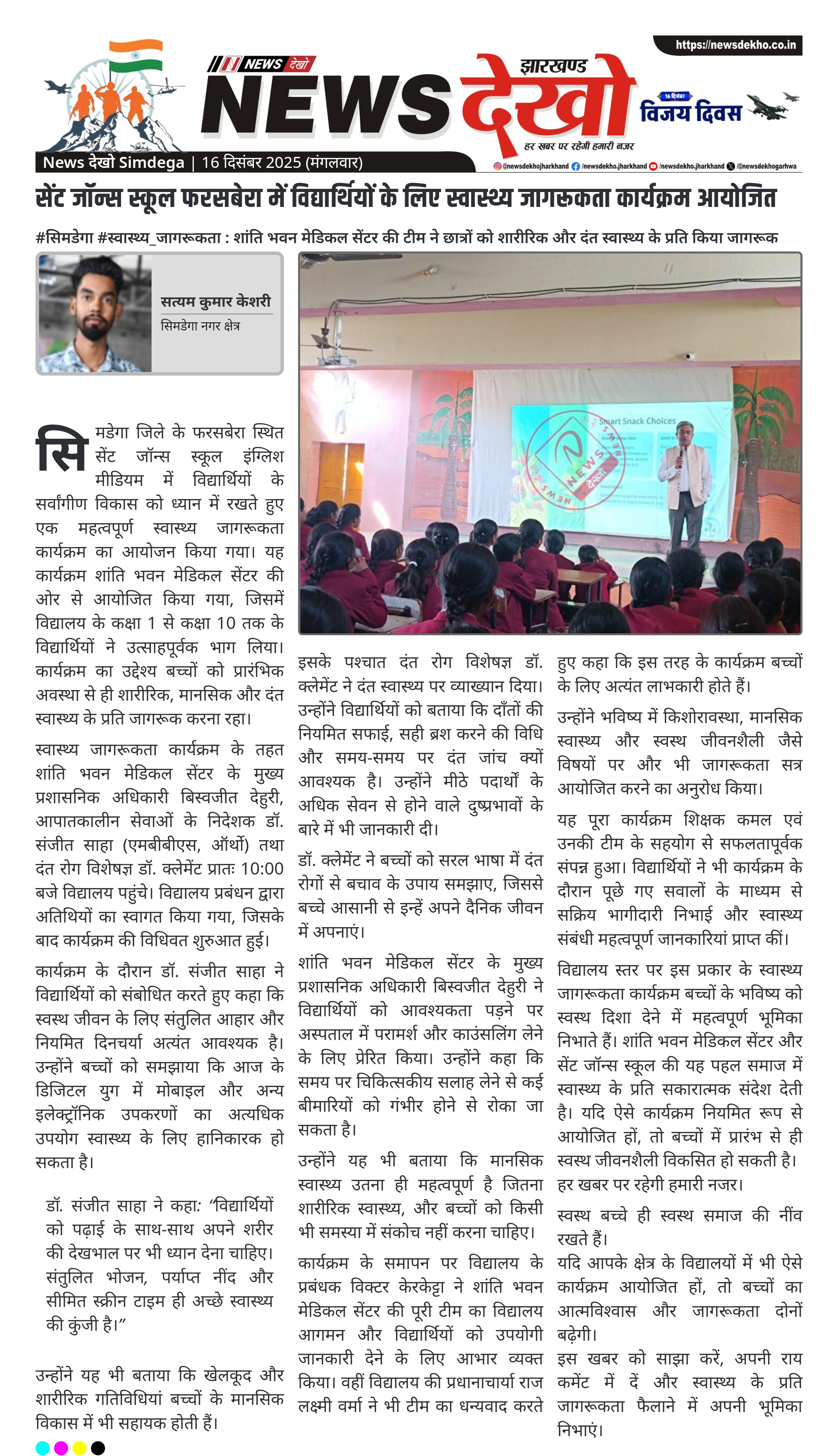 #सिमडेगा #स्वास्थ्य_जागरूकता : शांति भवन मेडिकल सेंटर की टीम ने छात्रों को शारीरिक और दंत स्वास्थ्य के प्रति किया जागरूक सेंट जॉन्स स्कूल इंग्लिश मीडियम, फरसबेरा में स्वास्थ्य जागरूकता कार्यक्रम का आयोजन। शांति भवन मेडिकल सेंटर की विशेषज्ञ टीम ने विद्यार्थियों को दी स्वास्थ्य संबंधी जानकारी। डॉ. संजीत साहा ने…