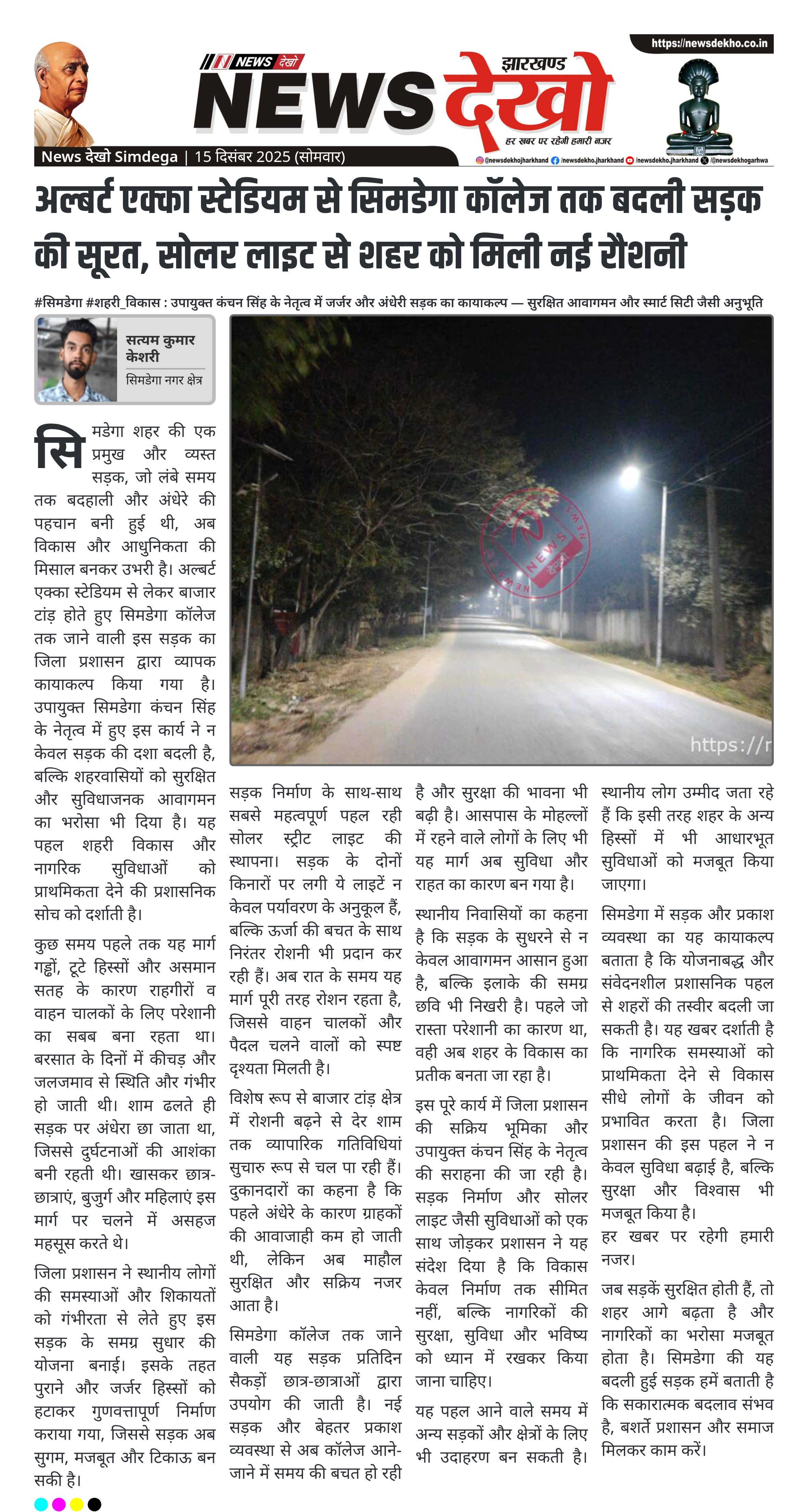 #सिमडेगा #शहरी_विकास : उपायुक्त कंचन सिंह के नेतृत्व में जर्जर और अंधेरी सड़क का कायाकल्प — सुरक्षित आवागमन और स्मार्ट सिटी जैसी अनुभूति अल्बर्ट एक्का स्टेडियम से सिमडेगा कॉलेज तक सड़क का पूर्ण कायाकल्प। उपायुक्त कंचन सिंह के नेतृत्व में जिला प्रशासन की पहल। बाजार टांड़ जैसे व्यस्त क्षेत्र में…