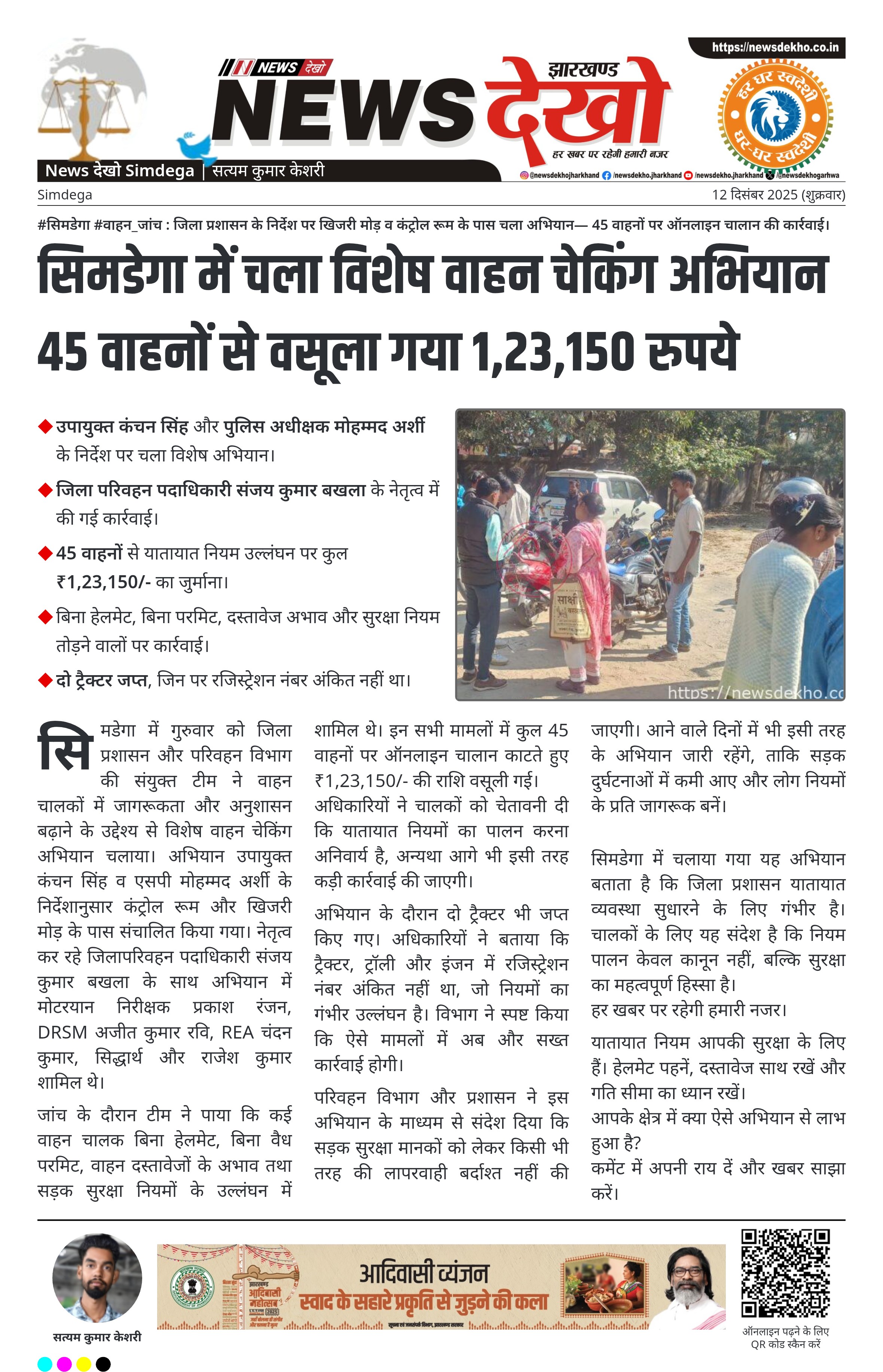 सिमडेगा में चला विशेष वाहन चेकिंग अभियान 45 वाहनों से वसूला गया 1,23,150 रुपये