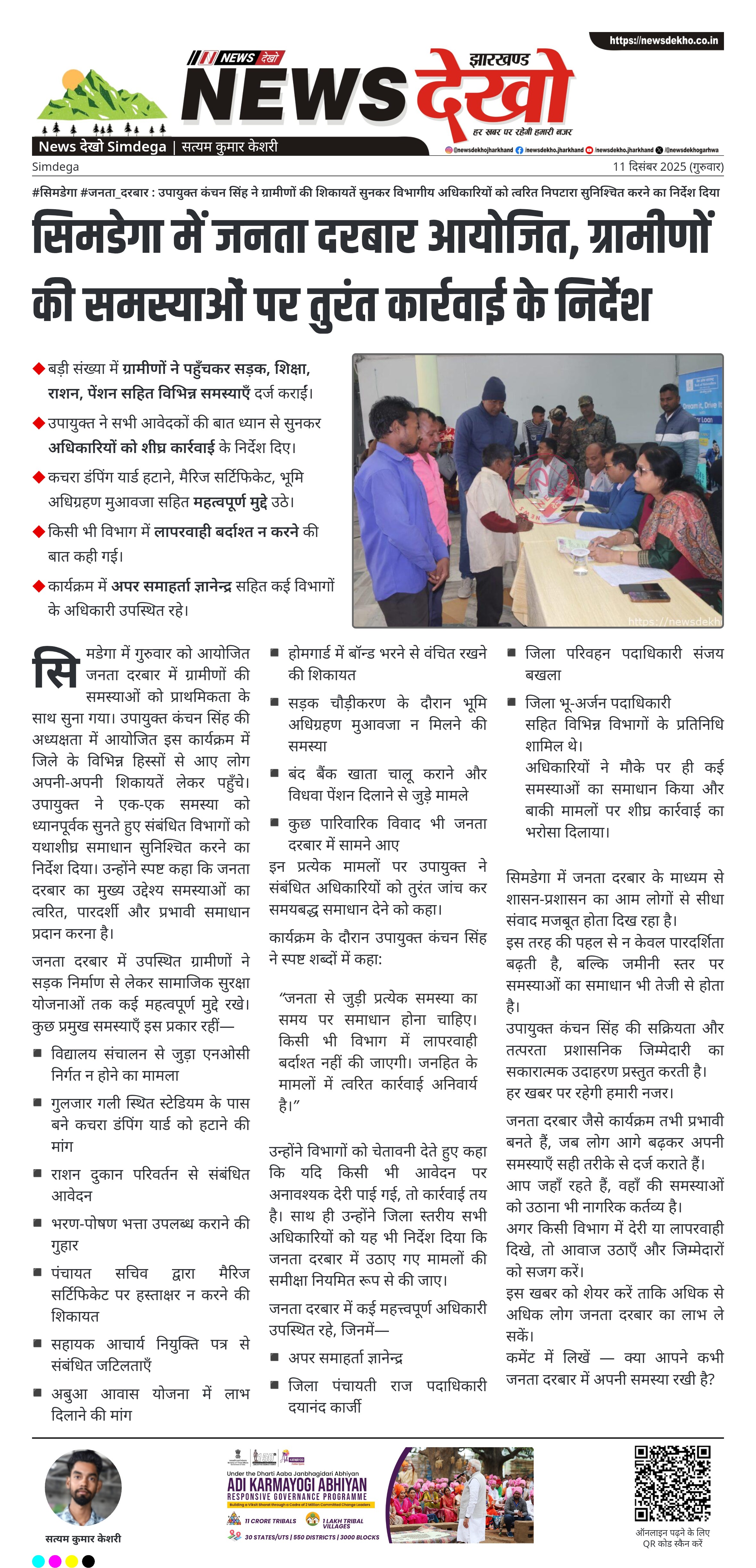 #सिमडेगा #जनता_दरबार : उपायुक्त कंचन सिंह ने ग्रामीणों की शिकायतें सुनकर विभागीय अधिकारियों को त्वरित निपटारा सुनिश्चित करने का निर्देश दिया उपायुक्त कंचन सिंह की अध्यक्षता में जनता दरबार का आयोजन हुआ। बड़ी संख्या में ग्रामीणों ने पहुँचकर सड़क, शिक्षा, राशन, पेंशन सहित विभिन्न समस्याएँ दर्ज कराईं। उपायुक्त ने सभी…