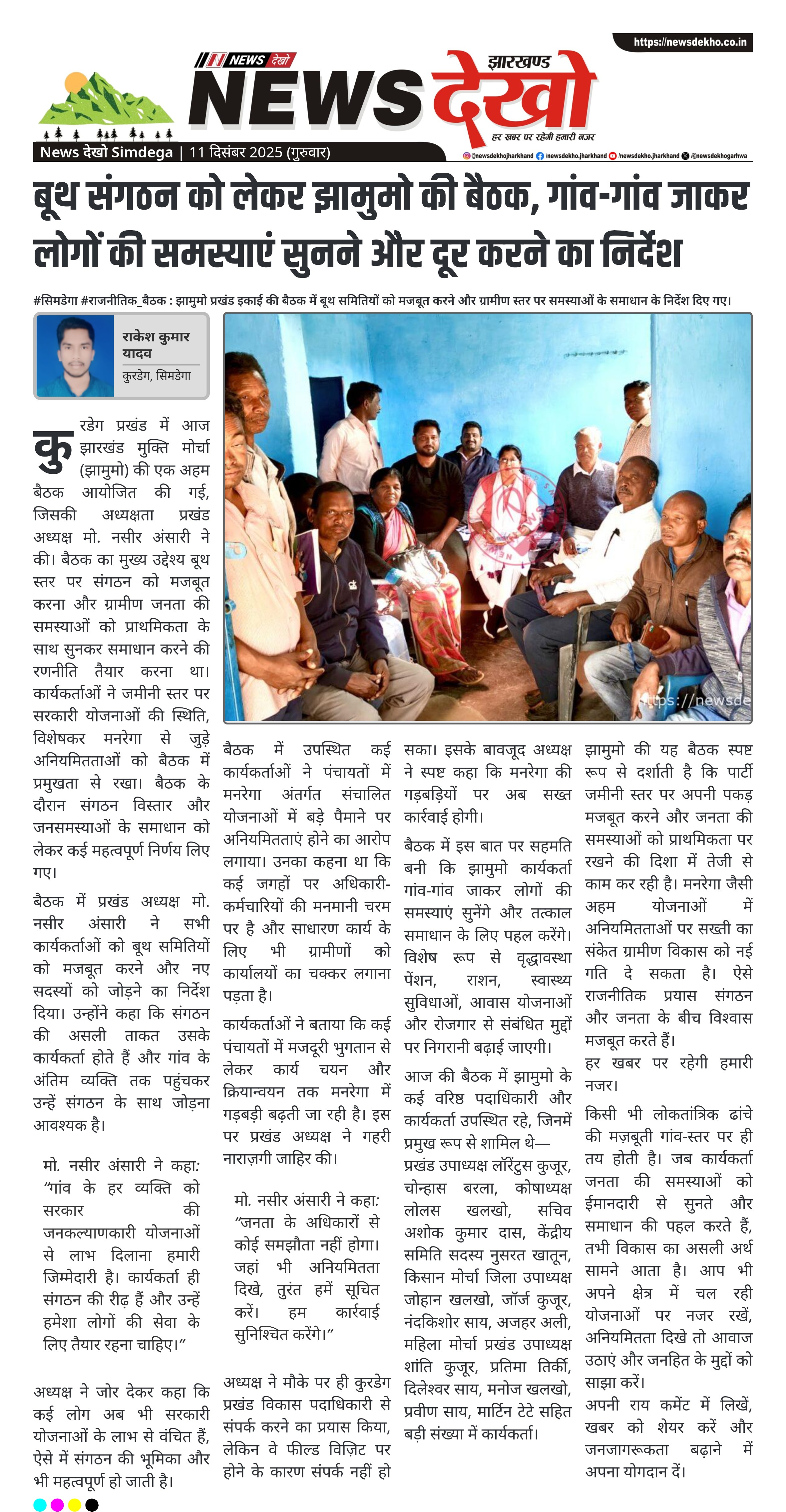 #कुरडेग #झामुमो_बैठक : गांव-गांव जाकर लोगों की समस्याएं सुनने और जनकल्याणकारी योजनाओं के लाभ दिलाने पर जोर कुरडेग प्रखंड में झारखंड मुक्ति मोर्चा (झामुमो) की बैठक आयोजित। प्रखण्ड अध्यक्ष मो. नसीर अंसारी ने बूथ समितियों को मजबूत करने और सदस्यों को जोड़ने का निर्देश दिया। बैठक में मनरेगा योजनाओं में…