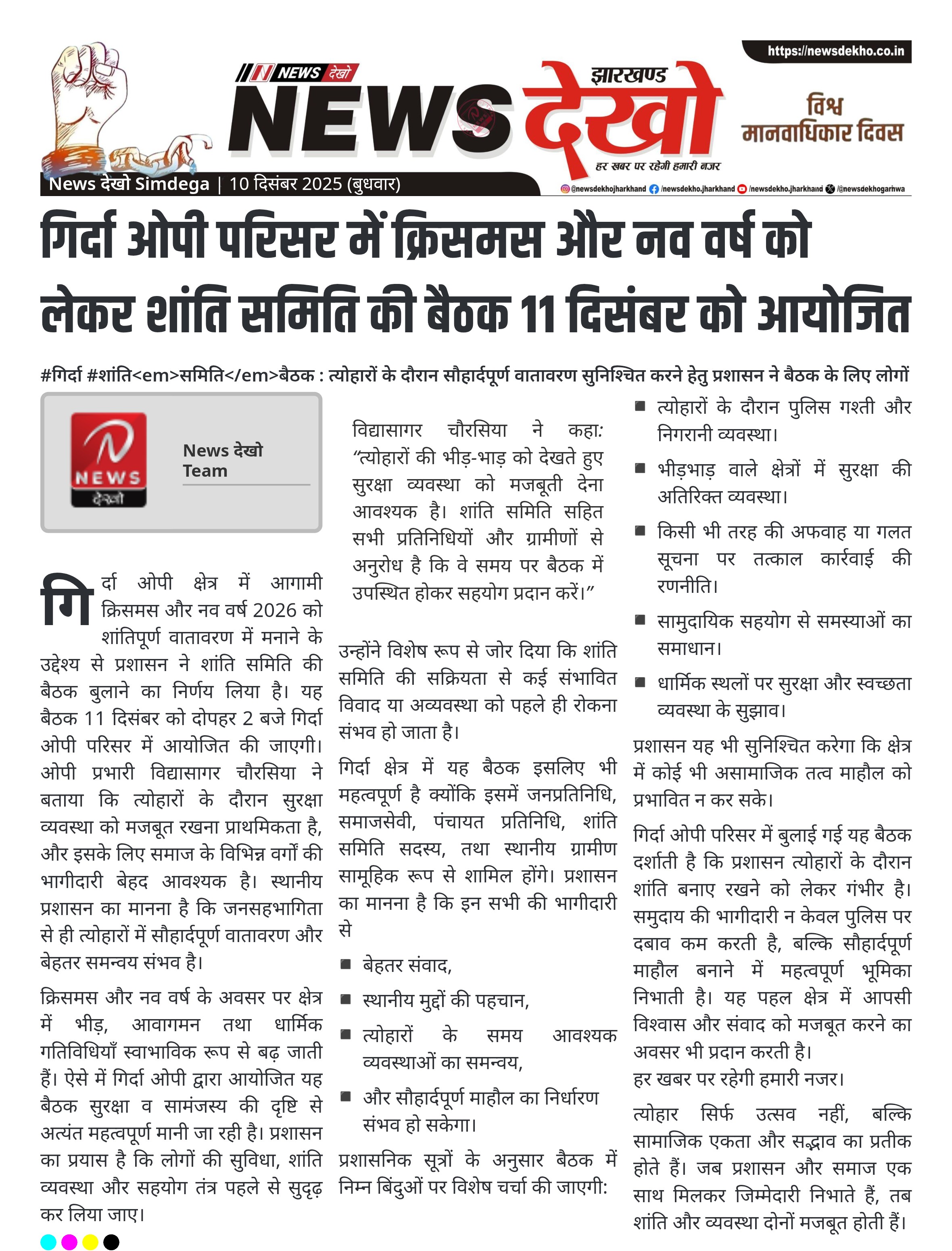 #गिर्दा #शांतिसमितिबैठक : त्योहारों के दौरान सौहार्दपूर्ण वातावरण सुनिश्चित करने हेतु प्रशासन ने बैठक के लिए लोगों से सक्रिय उपस्थिति की अपील की। 11 दिसंबर, दिन गुरुवार, अपराह्न 02:00 बजे बैठक निर्धारित। आयोजन स्थल: गिर्दा ओपी परिसर, बानो क्षेत्र। बैठक का नेतृत्व ओपी प्रभारी विद्यासागर चौरसिया करेंगे। उद्देश्य: क्रिसमस व…