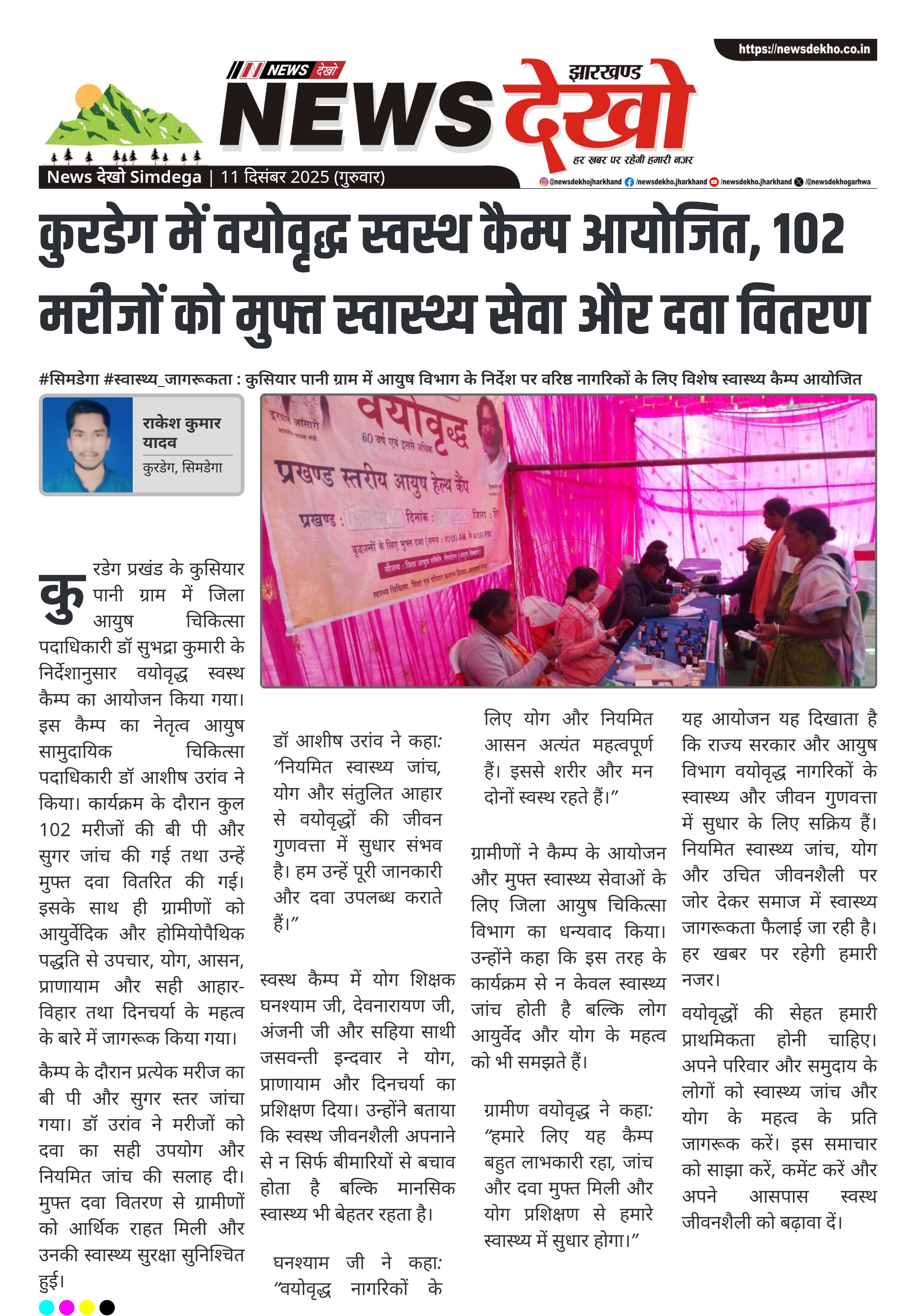 कुरडेग में वयोवृद्ध स्वस्थ कैम्प आयोजित, 102 मरीजों को मुफ्त स्वास्थ्य सेवा और दवा वितरण