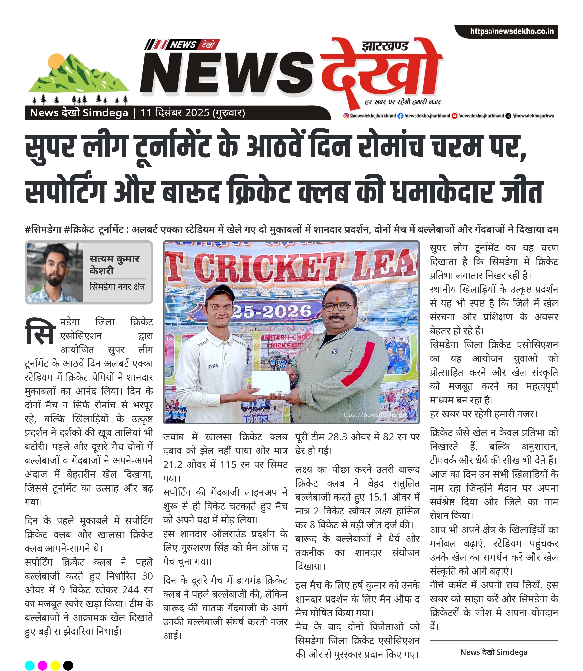 #सिमडेगा #क्रिकेट_टूर्नामेंट : अलबर्ट एक्का स्टेडियम में खेले गए दो मुकाबलों में शानदार प्रदर्शन, दोनों मैच में बल्लेबाजों और गेंदबाजों ने दिखाया दम अलबर्ट एक्का स्टेडियम में सुपर लीग टूर्नामेंट के आठवें दिन दो मैच खेले गए। पहले मैच में सपोर्टिंग क्रिकेट क्लब ने खालसा क्रिकेट क्लब को 129 रन…