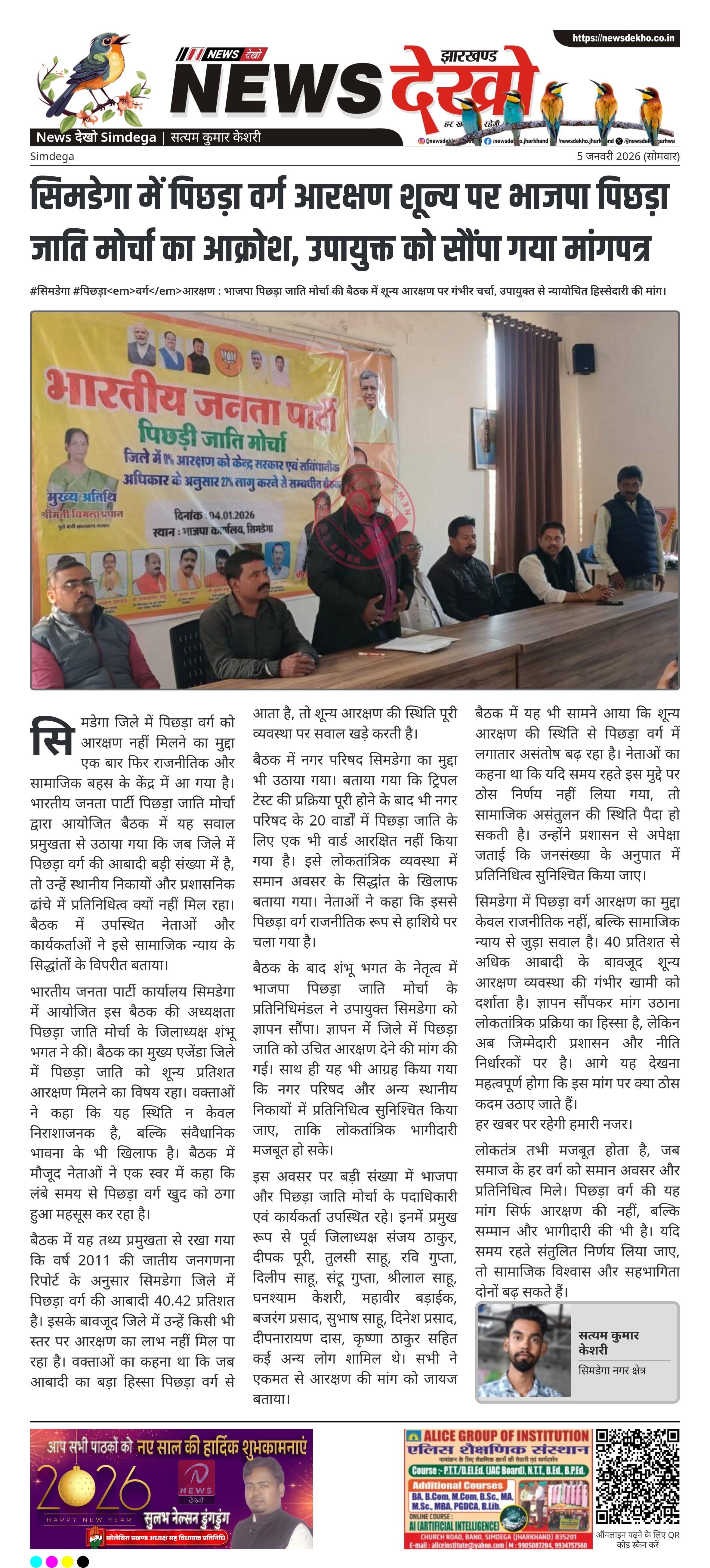 #सिमडेगा #पिछड़ावर्गआरक्षण : भाजपा पिछड़ा जाति मोर्चा की बैठक में शून्य आरक्षण पर गंभीर चर्चा, उपायुक्त से न्यायोचित हिस्सेदारी की मांग। भाजपा पिछड़ा जाति मोर्चा की आवश्यक बैठक भाजपा कार्यालय सिमडेगा में आयोजित। जिलाध्यक्ष शंभू भगत की अध्यक्षता में शून्य आरक्षण पर विशेष चर्चा। 2011 जातीय जनगणना के अनुसार जिले…