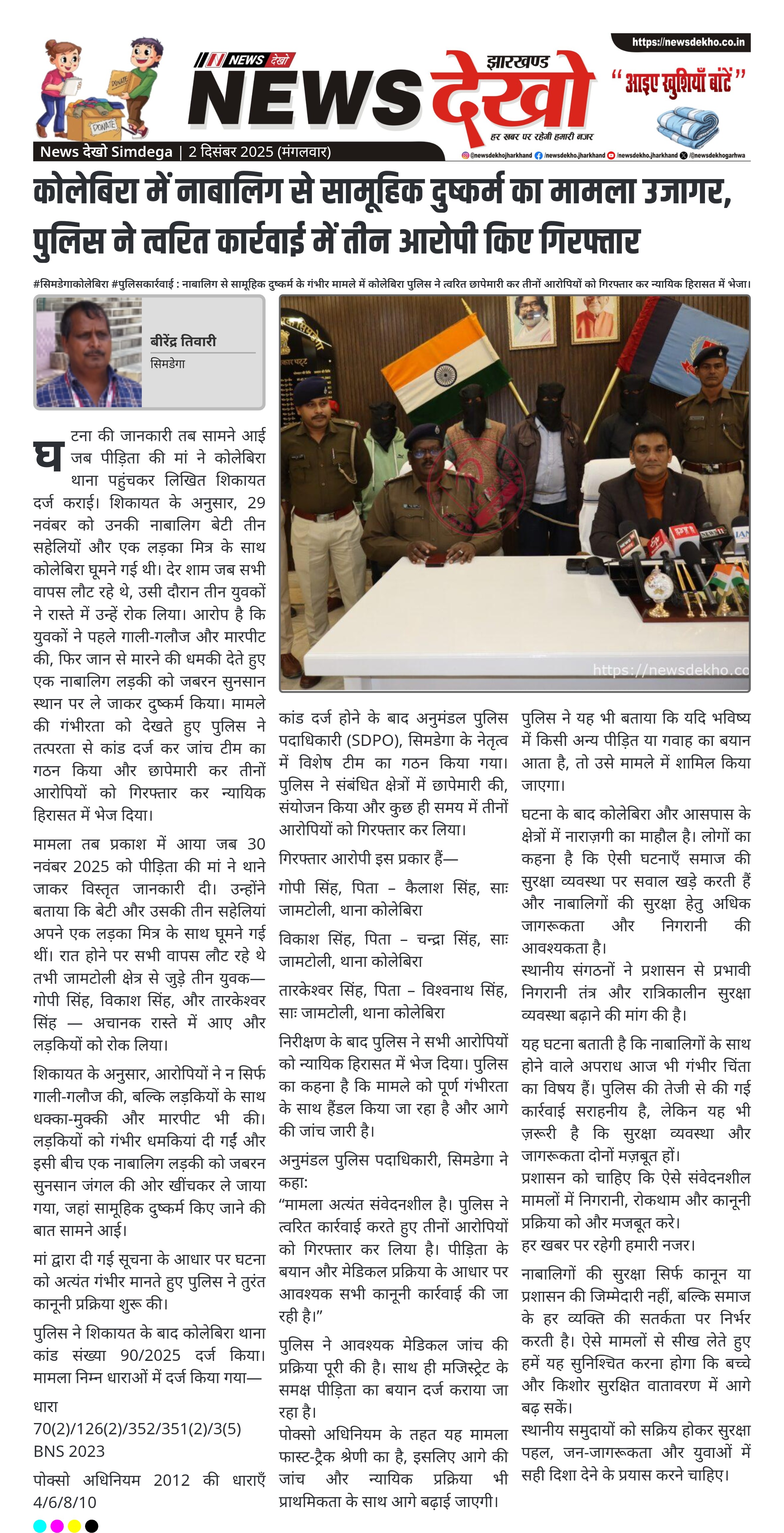 #सिमडेगाकोलेबिरा #पुलिसकार्रवाई : नाबालिग से सामूहिक दुष्कर्म के गंभीर मामले में कोलेबिरा पुलिस ने त्वरित छापेमारी कर तीनों आरोपियों को गिरफ्तार कर न्यायिक हिरासत में भेजा। 29 नवंबर 2025 को घटना, 30 नवंबर को मां ने कोलेबिरा थाना में आवेदन दिया। घूमने गई नाबालिग व उसकी सहेलियों को रास्ते में…