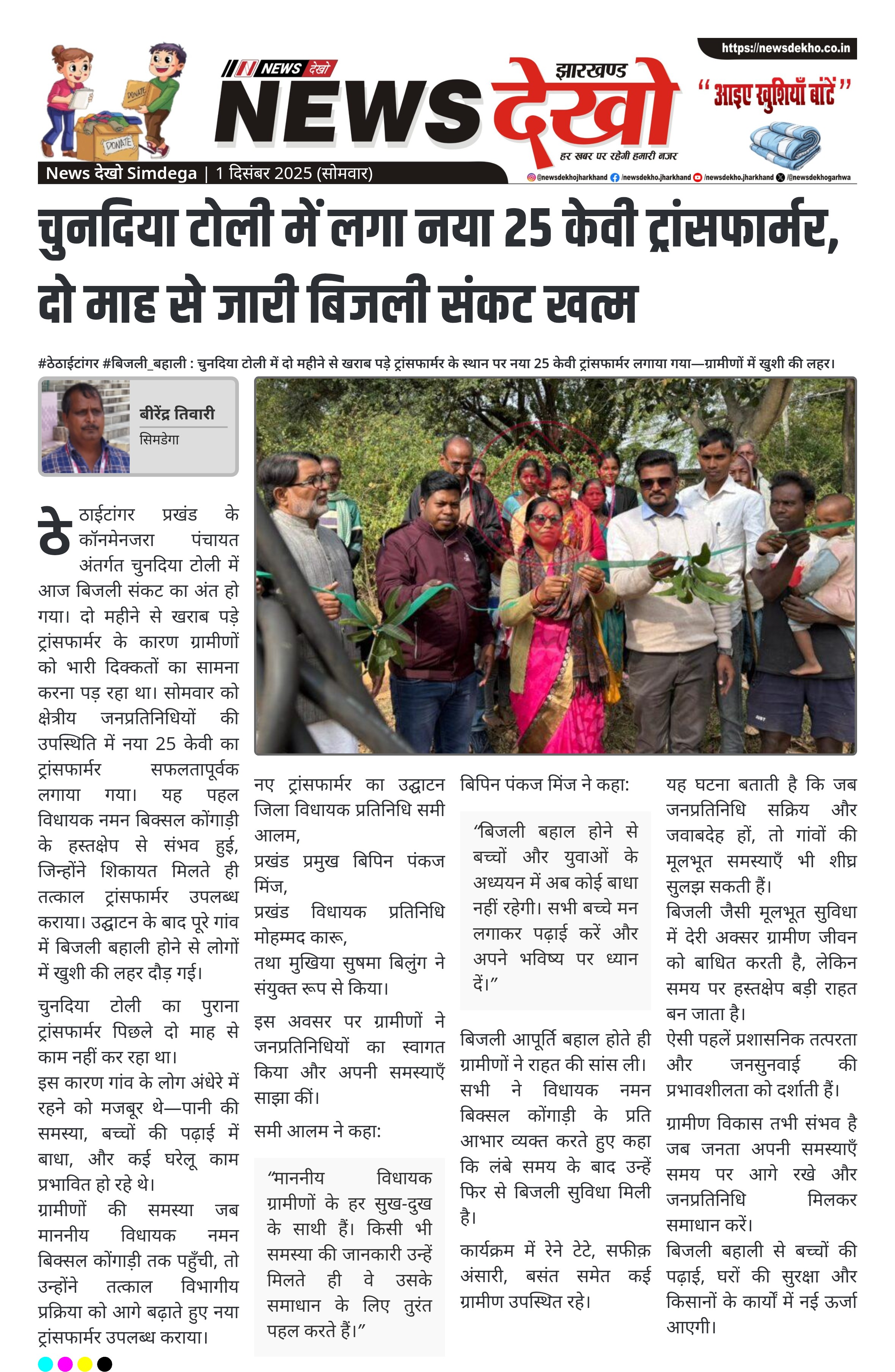 #ठेठाईटांगर #बिजली_बहाली : चुनदिया टोली में दो महीने से खराब पड़े ट्रांसफार्मर के स्थान पर नया 25 केवी ट्रांसफार्मर लगाया गया—ग्रामीणों में खुशी की लहर। कॉनमेनजरा पंचायत के चुनदिया टोली में नया 25 केवी ट्रांसफार्मर स्थापित किया गया। उद्घाटन में समी आलम, बिपिन पंकज मिंज, मोहम्मद कारू, सुषमा बिलुंग ने…