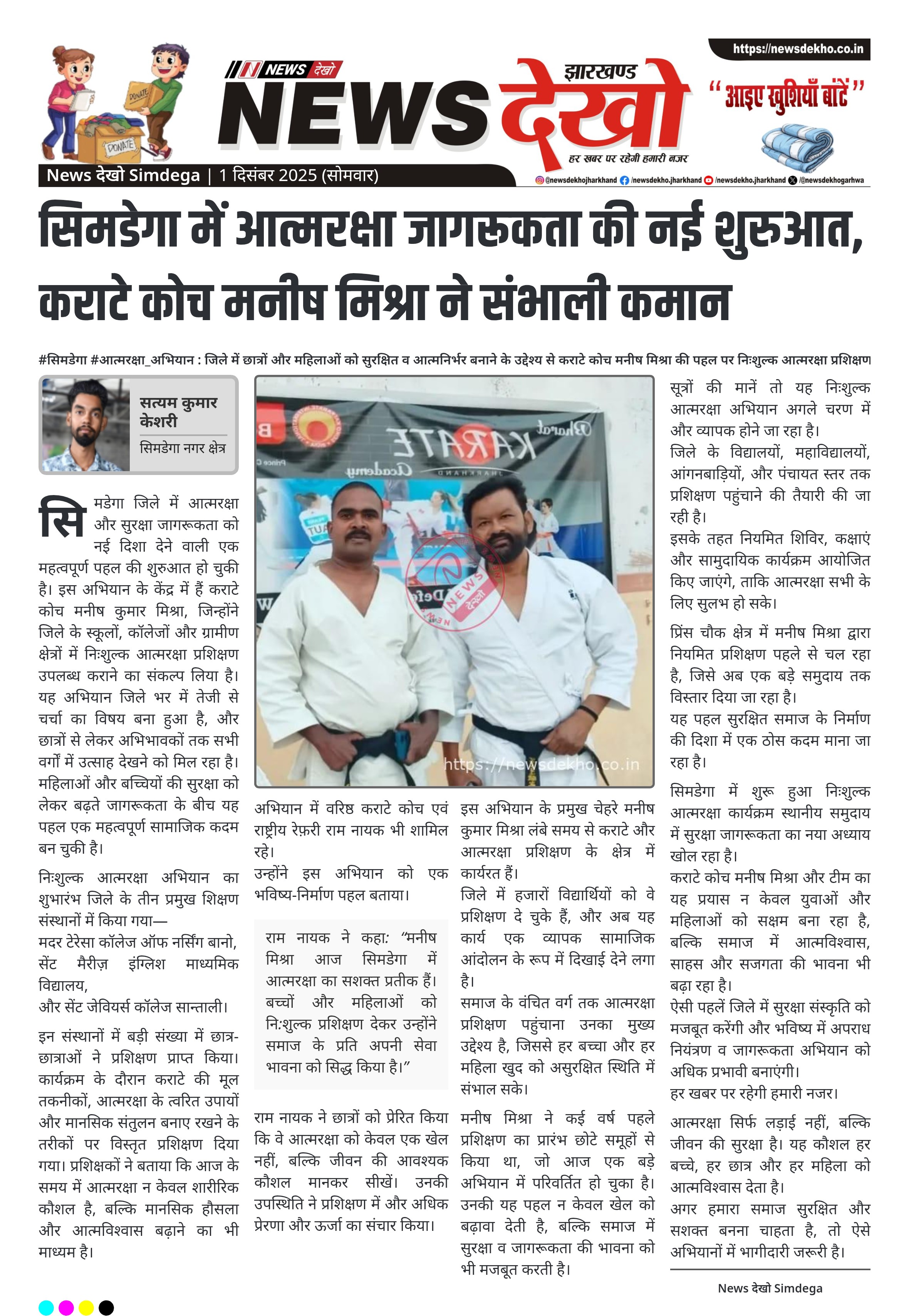 सिमडेगा में आत्मरक्षा जागरूकता की नई शुरुआत, कराटे कोच मनीष मिश्रा ने संभाली कमान