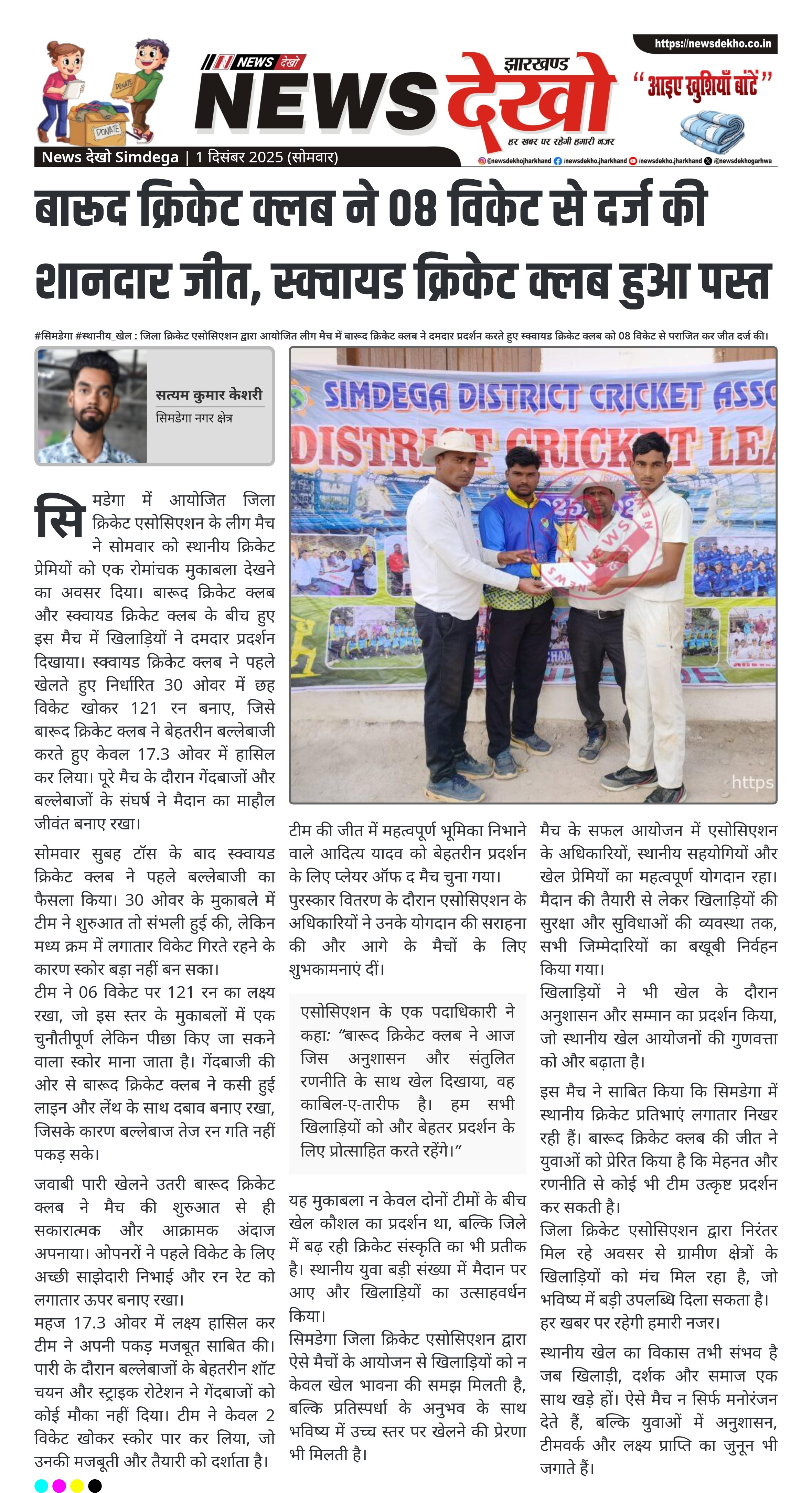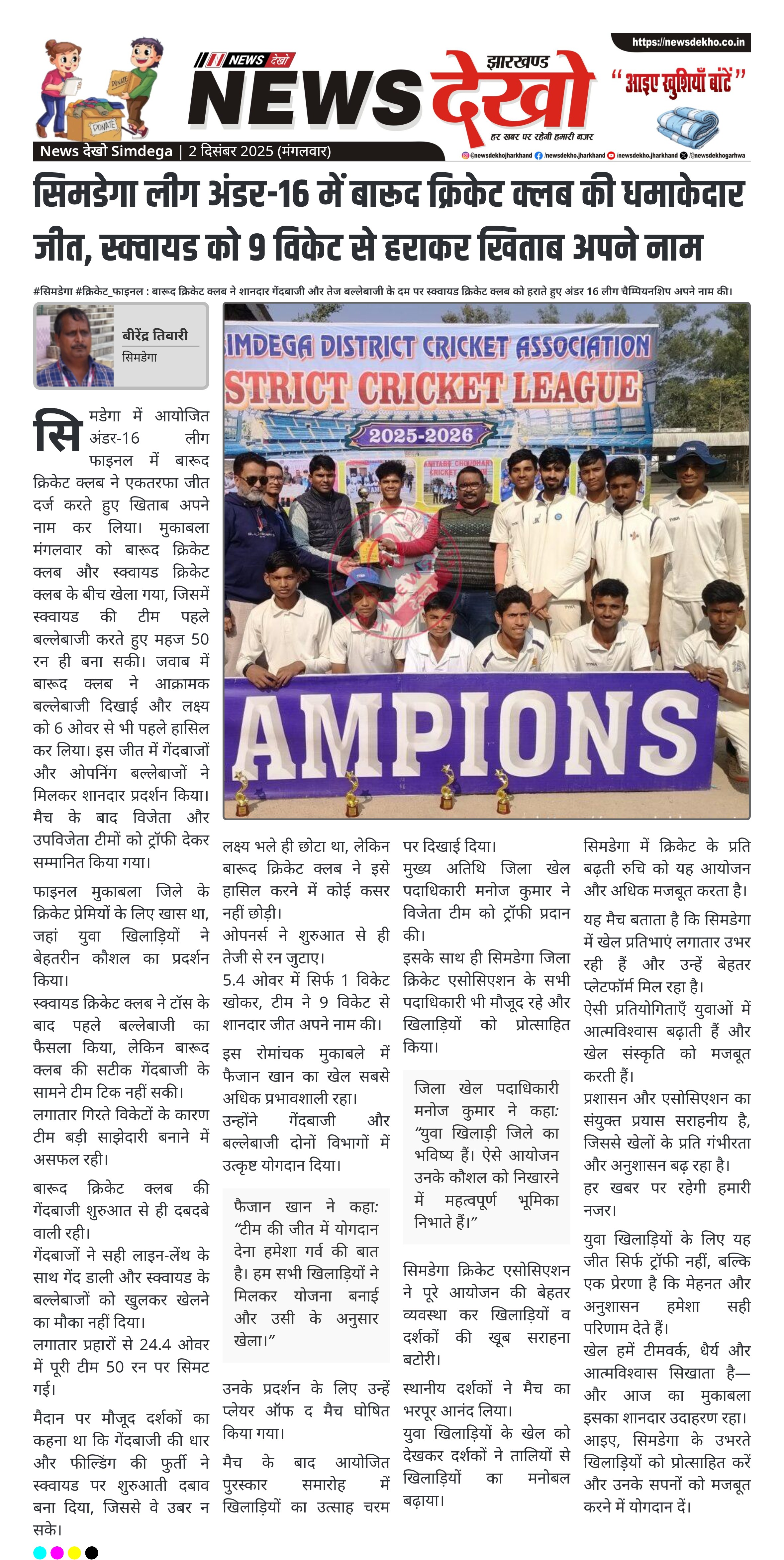 सिमडेगा लीग अंडर-16 में बारूद क्रिकेट क्लब की धमाकेदार जीत, स्क्वायड को 9 विकेट से हराकर खिताब अपने नाम