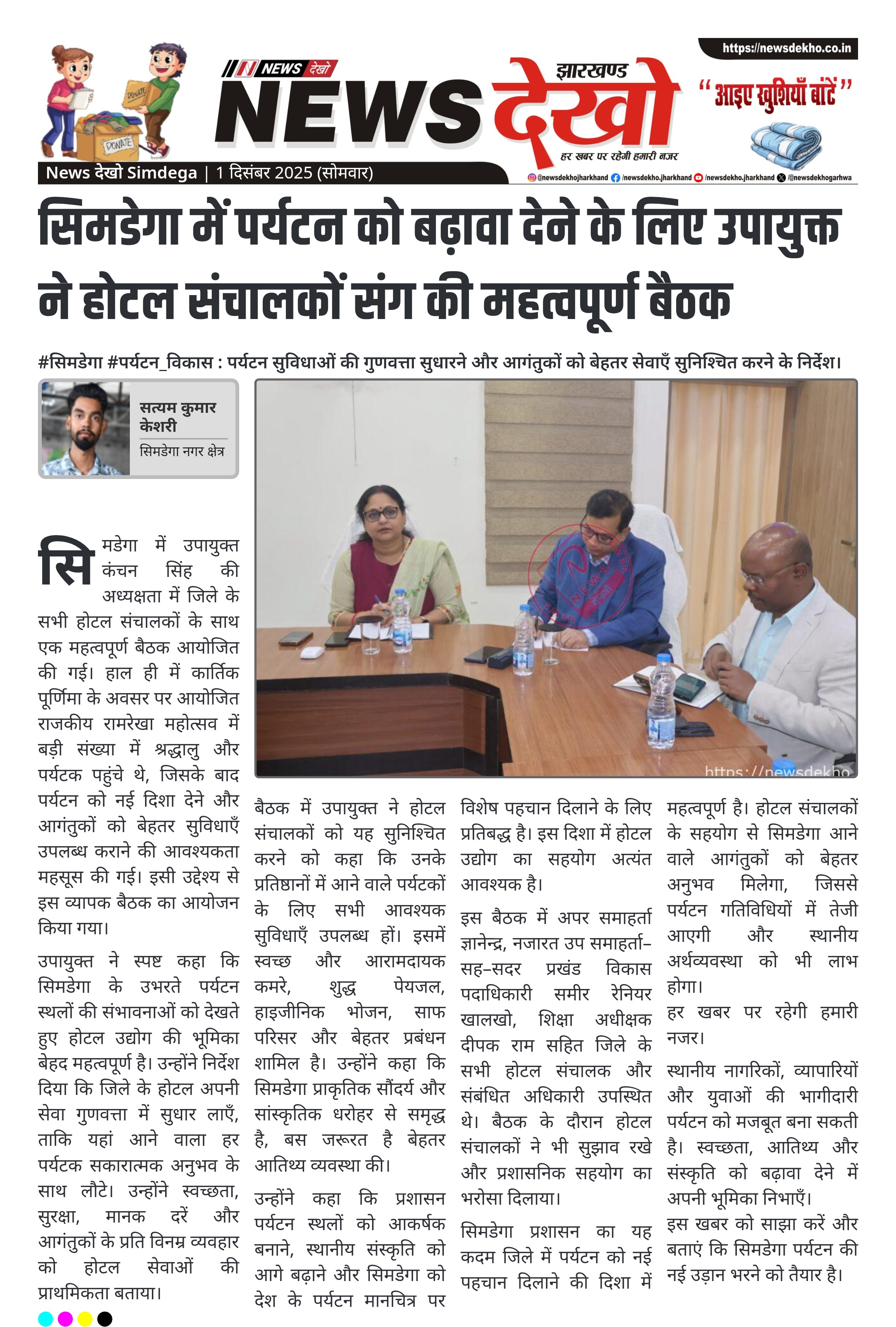 #सिमडेगा #पर्यटन_विकास : पर्यटन सुविधाओं की गुणवत्ता सुधारने और आगंतुकों को बेहतर सेवाएँ सुनिश्चित करने के निर्देश। उपायुक्त कंचन सिंह की अध्यक्षता में सिमडेगा जिले के होटल संचालकों की अहम बैठक आयोजित। राजकीय रामरेखा महोत्सव में बढ़ी पर्यटक संख्या को देखते हुए सेवाओं की गुणवत्ता सुधारने पर जोर। होटल संचालकों…