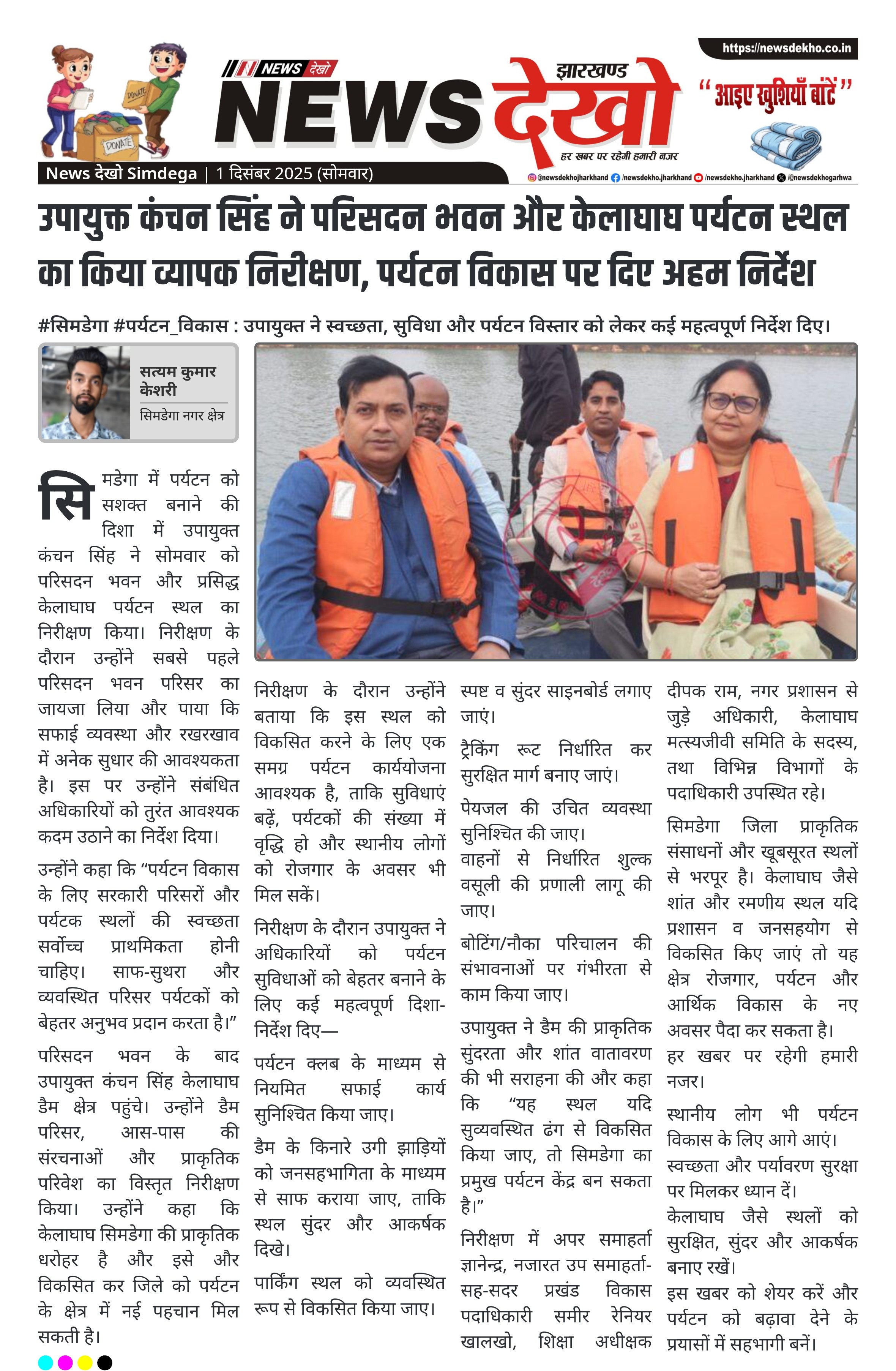 #सिमडेगा #पर्यटन_विकास : उपायुक्त ने स्वच्छता, सुविधा और पर्यटन विस्तार को लेकर कई महत्वपूर्ण निर्देश दिए। उपायुक्त कंचन सिंह ने परिसदन भवन व केलाघाघ डैम का किया निरीक्षण। परिसदन भवन की साफ–सफाई में सुधार हेतु अधिकारियों को दिए त्वरित निर्देश। केलाघाघ को पर्यटन मानचित्र पर स्थापित करने के लिए समग्र…