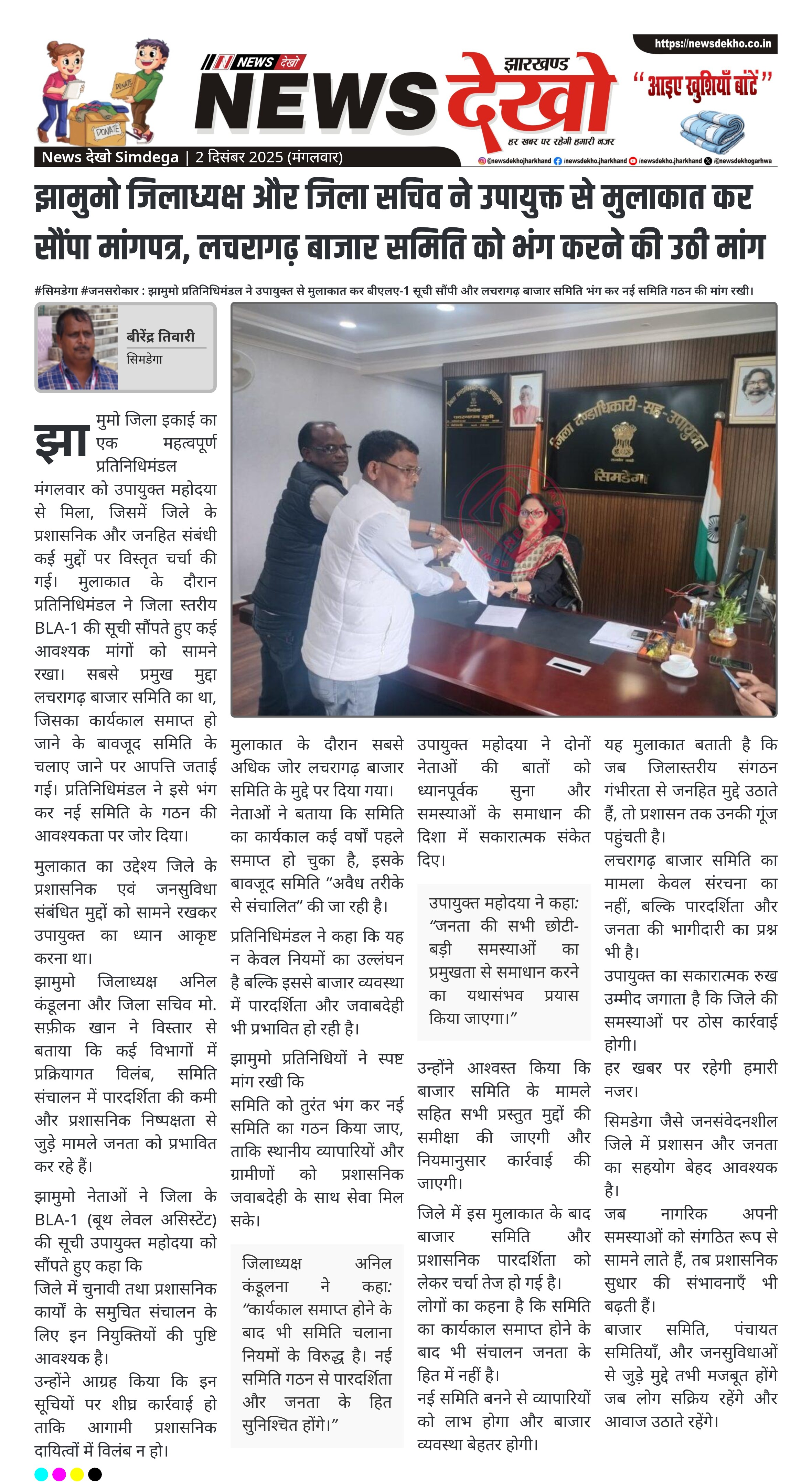#सिमडेगा #जनसरोकार : झामुमो प्रतिनिधिमंडल ने उपायुक्त से मुलाकात कर बीएलए-1 सूची सौंपी और लचरागढ़ बाजार समिति भंग कर नई समिति गठन की मांग रखी। झामुमो के जिलाध्यक्ष अनिल कंडूलना और जिला सचिव मो. सफ़ीक खान ने 2 दिसंबर 2025 को उपायुक्त से मुलाकात की। प्रतिनिधिमंडल ने जिला के BLA-1…
