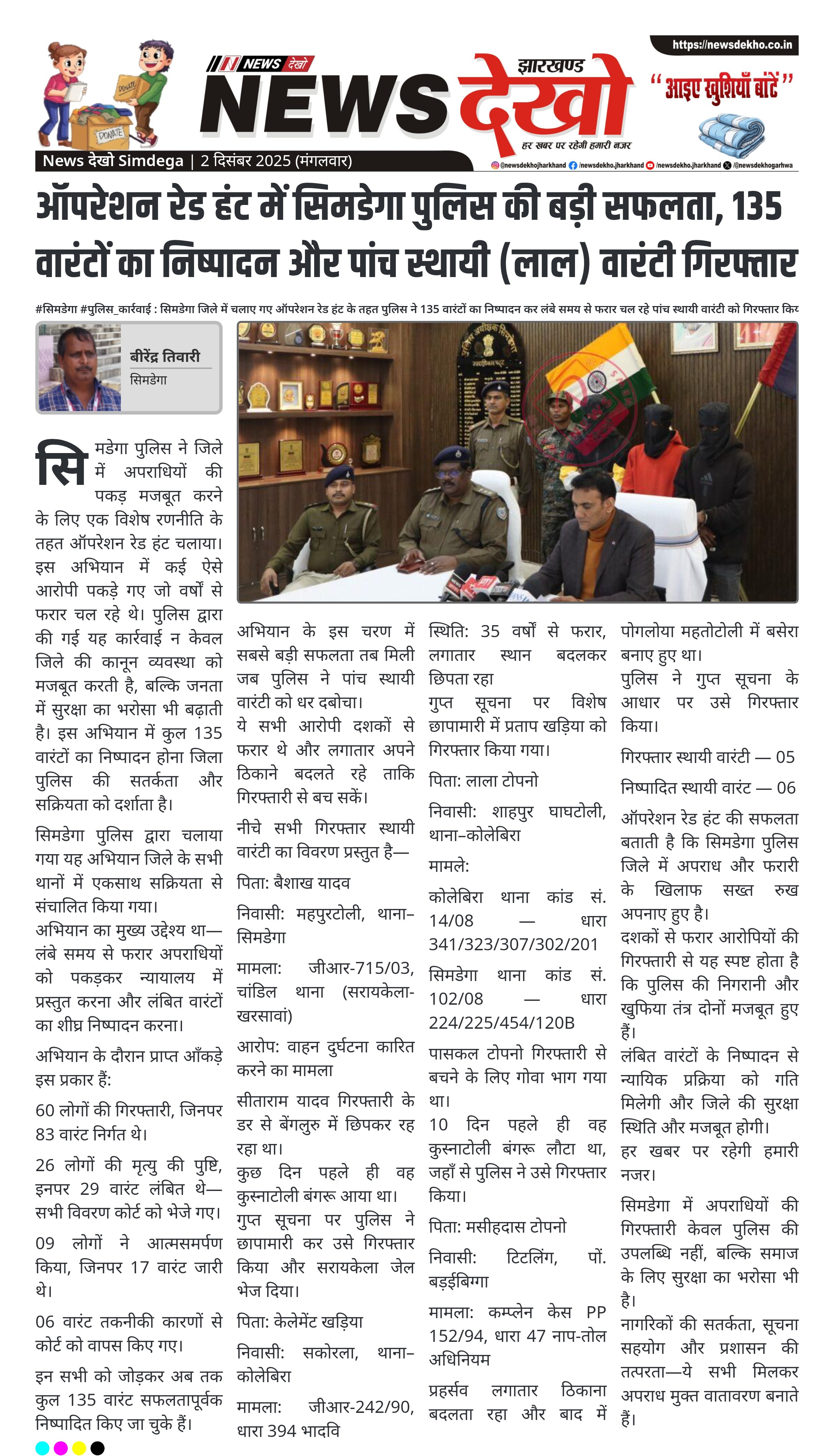 ऑपरेशन रेड हंट में सिमडेगा पुलिस की बड़ी सफलता, 135 वारंटों का निष्पादन और पांच स्थायी (लाल) वारंटी गिरफ्तार