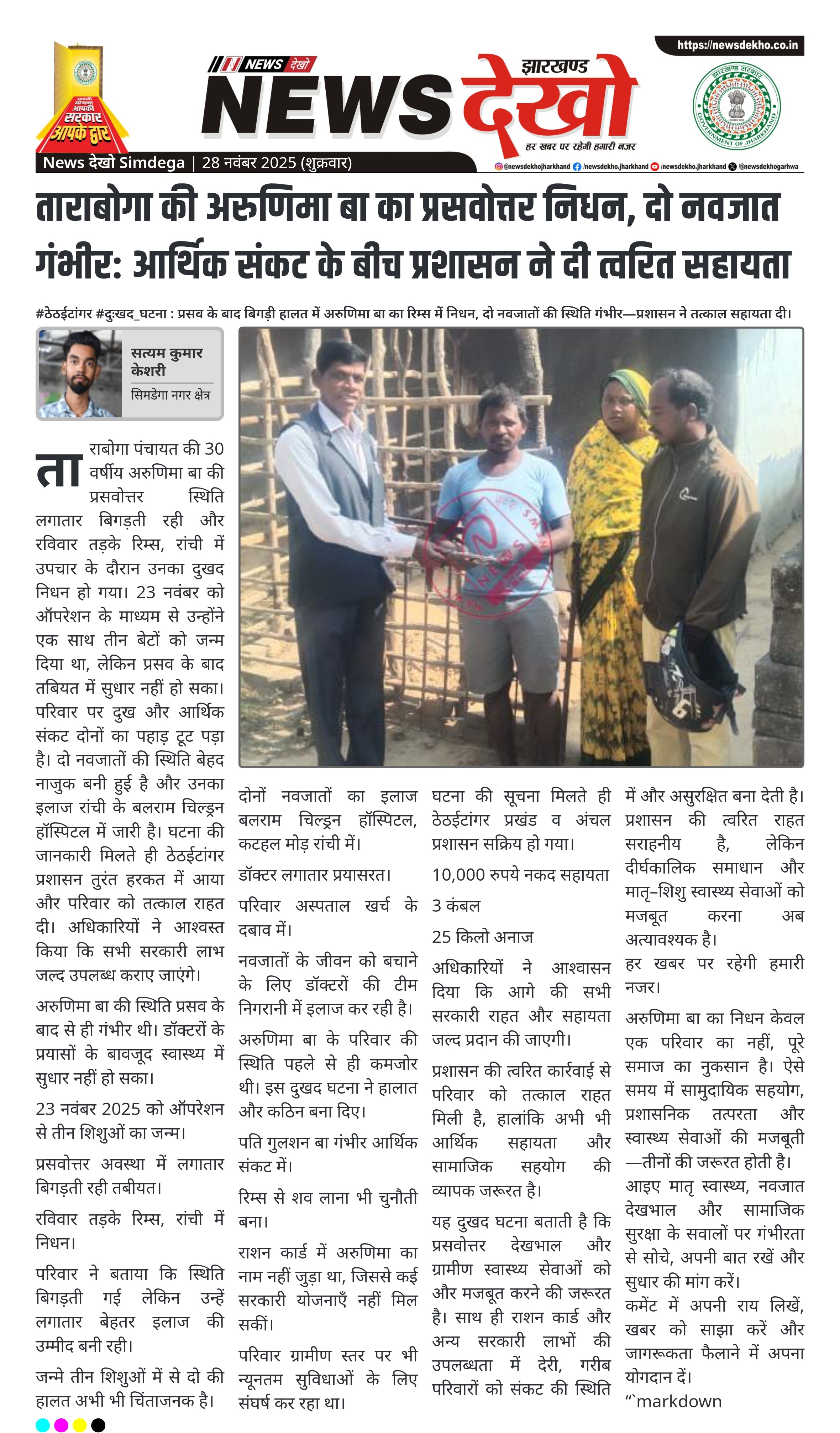#ठेठईटांगर #दुःखद_घटना : प्रसव के बाद बिगड़ी हालत में अरुणिमा बा का रिम्स में निधन, दो नवजातों की स्थिति गंभीर—प्रशासन ने तत्काल सहायता दी। ताराबोगा पंचायत की 30 वर्षीय अरुणिमा बा का प्रसवोत्तर स्थिति बिगड़ने से रिम्स रांची में निधन। 23 नवंबर 2025 को ऑपरेशन से जन्मे तीन शिशुओं में…