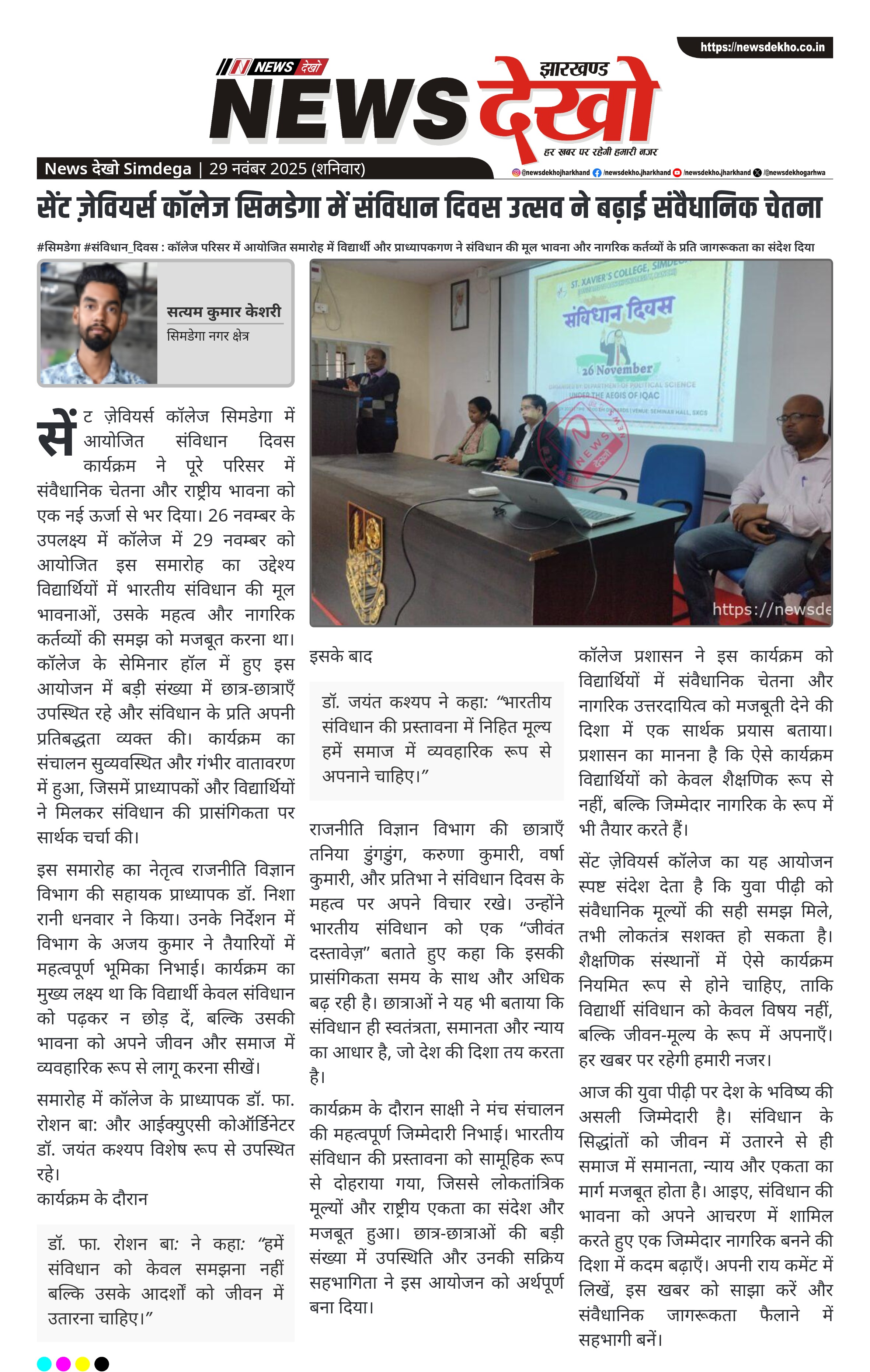 #सिमडेगा #संविधान_दिवस : सेंट ज़ेवियर्स कॉलेज में आयोजित विशेष कार्यक्रम में विद्यार्थियों को संविधान की भावना, मूल्यों और नागरिक कर्तव्यों के प्रति प्रेरित किया गया। सेंट ज़ेवियर्स कॉलेज सिमडेगा में संविधान दिवस का आयोजन सेमिनार हॉल में सम्पन्न हुआ। कार्यक्रम में डॉ. फा. रोशन बा: और डॉ. जयंत कश्यप विशेष…