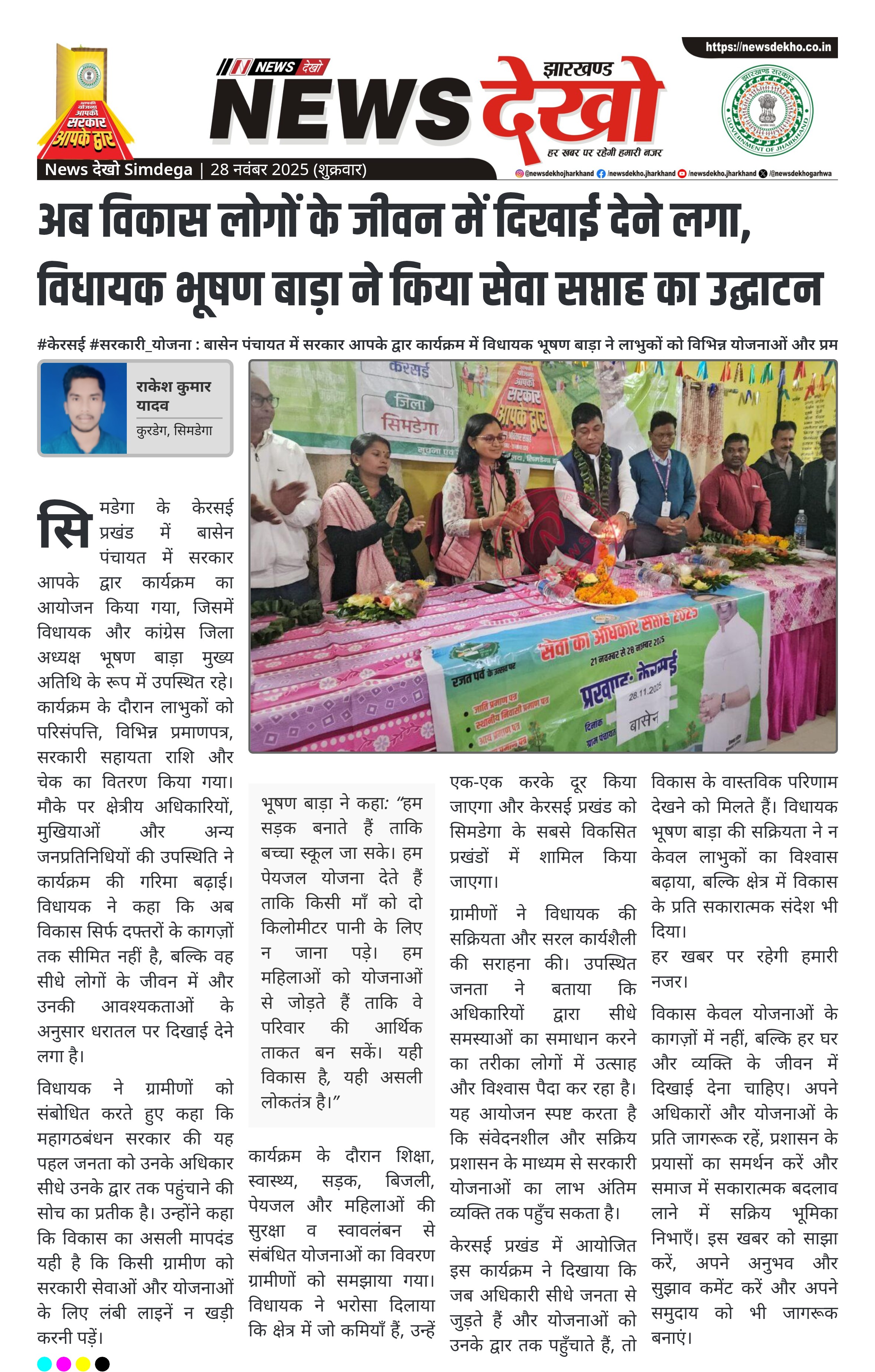 #केरसई #सरकारी_योजना : बासेन पंचायत में सरकार आपके द्वार कार्यक्रम में विधायक भूषण बाड़ा ने लाभुकों को विभिन्न योजनाओं और प्रमाणपत्रों का वितरण कर विकास की वास्तविक तस्वीर प्रस्तुत की केरसई प्रखंड, बासेन पंचायत में सेवा का अधिकार सप्ताह का आयोजन। विधायक भूषण बाड़ा ने मुख्य अतिथि के रूप में…