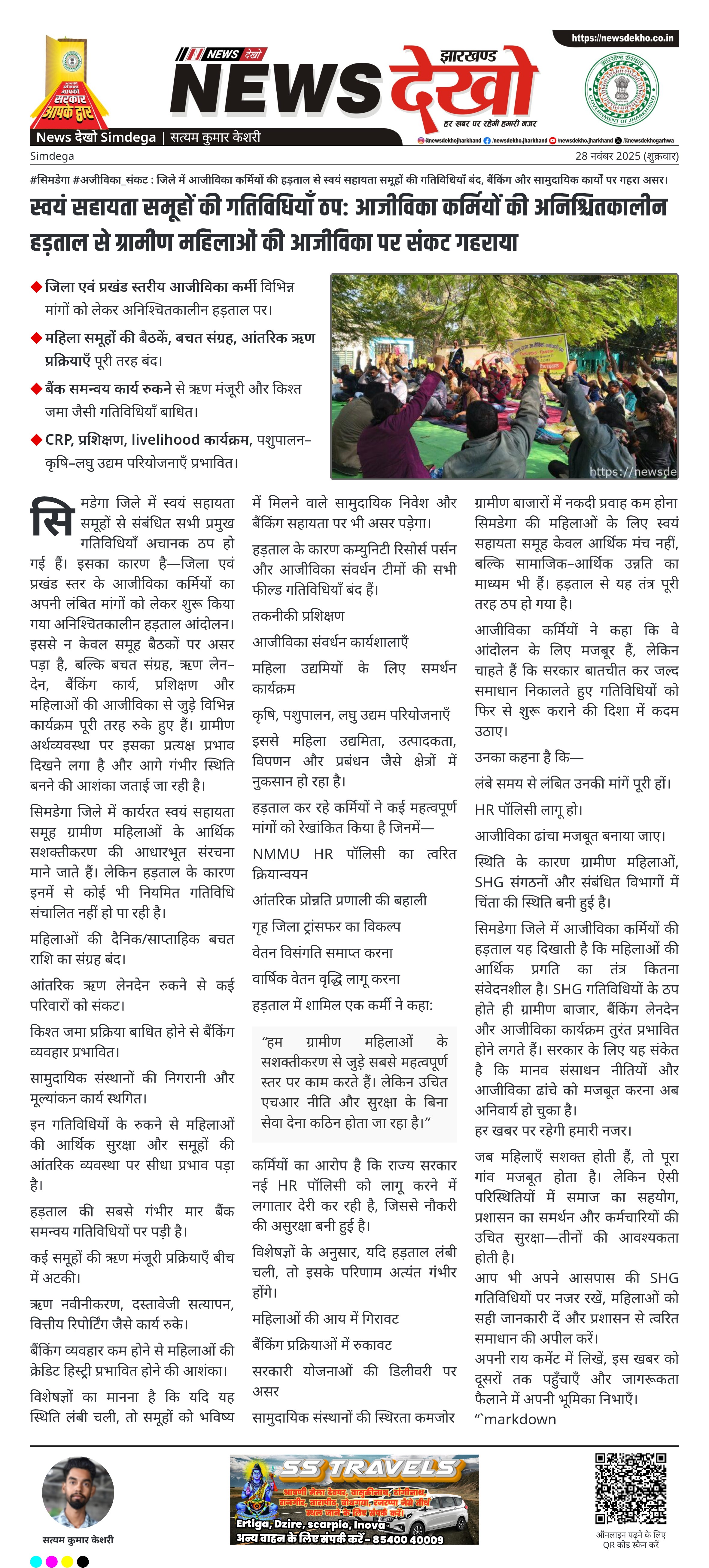 #सिमडेगा #अजीविका_संकट : जिले में आजीविका कर्मियों की हड़ताल से स्वयं सहायता समूहों की गतिविधियाँ बंद, बैंकिंग और सामुदायिक कार्यों पर गहरा असर। सिमडेगा जिले में स्वयं सहायता समूहों से जुड़ी लगभग सभी गतिविधियाँ ठप। जिला एवं प्रखंड स्तरीय आजीविका कर्मी विभिन्न मांगों को लेकर अनिश्चितकालीन हड़ताल पर। महिला समूहों…