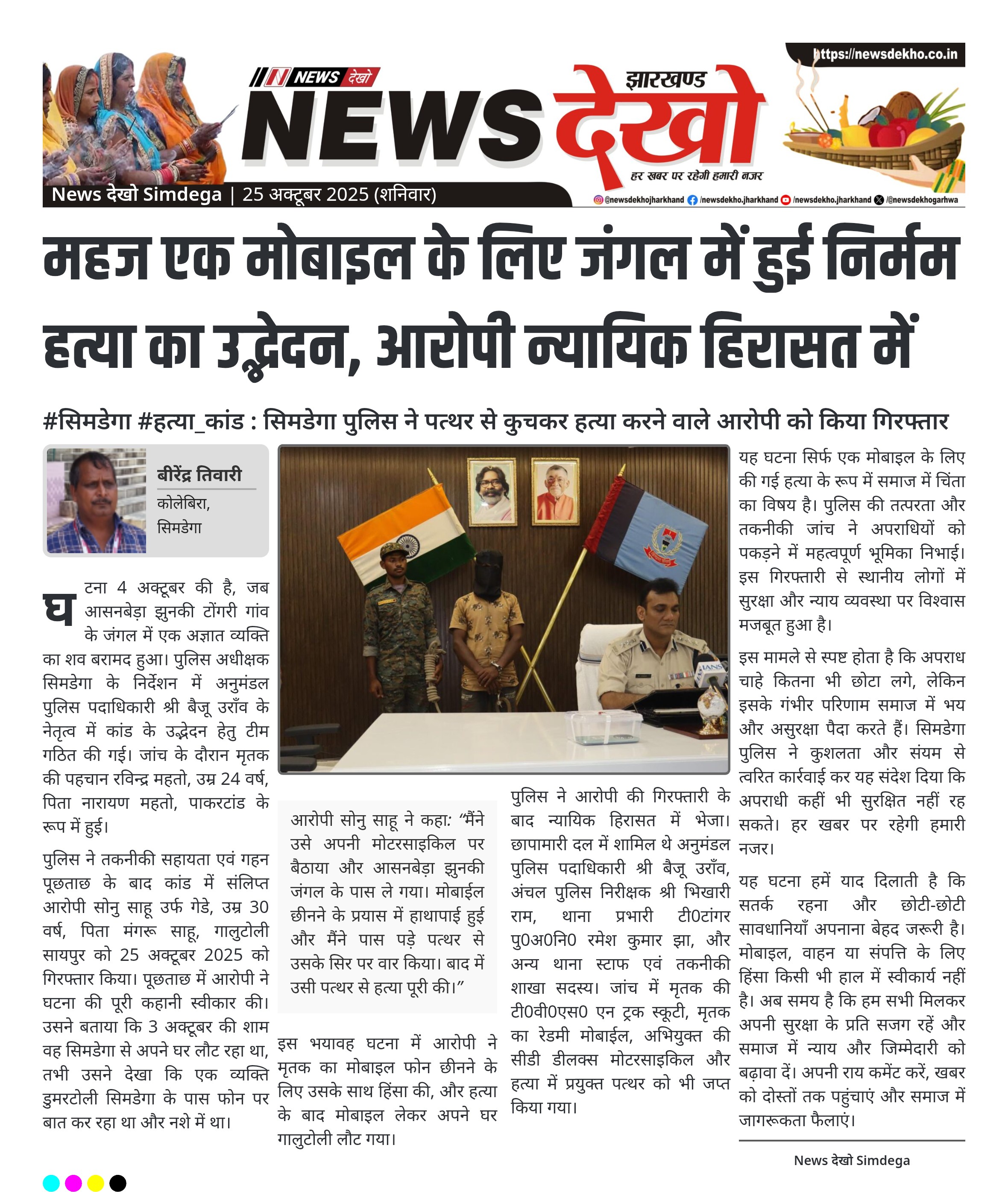 #सिमडेगा #हत्या_कांड : सिमडेगा पुलिस ने पत्थर से कुचकर हत्या करने वाले आरोपी को किया गिरफ्तार टी0टांगर थाना अंतर्गत 4 अक्टूबर को आसनबेड़ा झुनकी टोंगरी गांव में अज्ञात शव बरामद। मृतक की पहचान रविन्द्र महतो, उम्र 24 वर्ष, पिता नारायण महतो, पाकरटांड जिला सिमडेगा। अभियुक्त सोनु साहू उर्फ गेडे, उम्र…