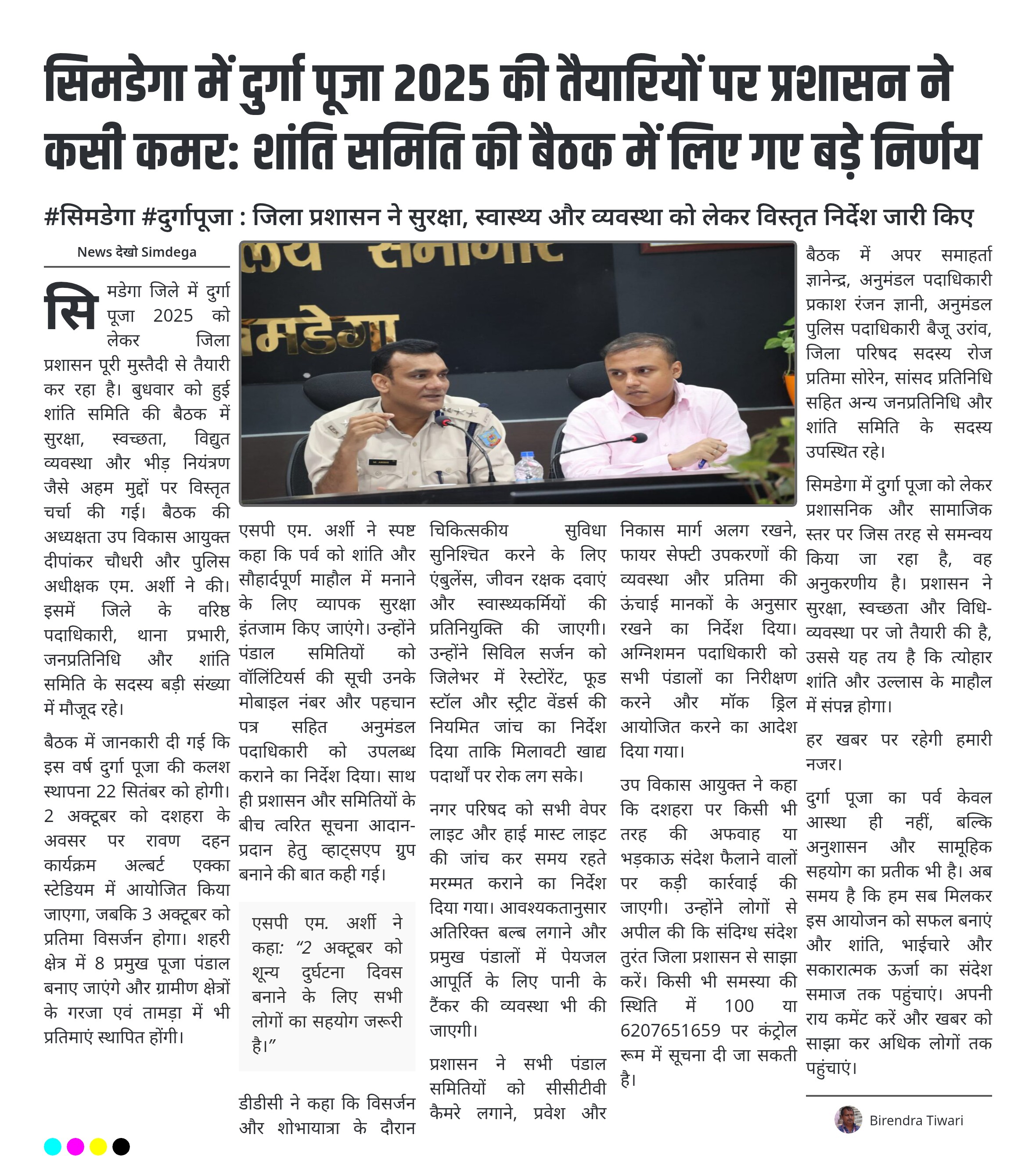 #सिमडेगा #दुर्गापूजा : जिला प्रशासन ने सुरक्षा, स्वास्थ्य और व्यवस्था को लेकर विस्तृत निर्देश जारी किए 22 सितंबर को होगी दुर्गा पूजा की कलश स्थापना, 2 अक्टूबर को अल्बर्ट एक्का स्टेडियम में रावण दहन। 3 अक्टूबर को प्रतिमा विसर्जन, शहर में 8 पूजा पंडाल, ग्रामीण क्षेत्र में गरजा और तामड़ा…