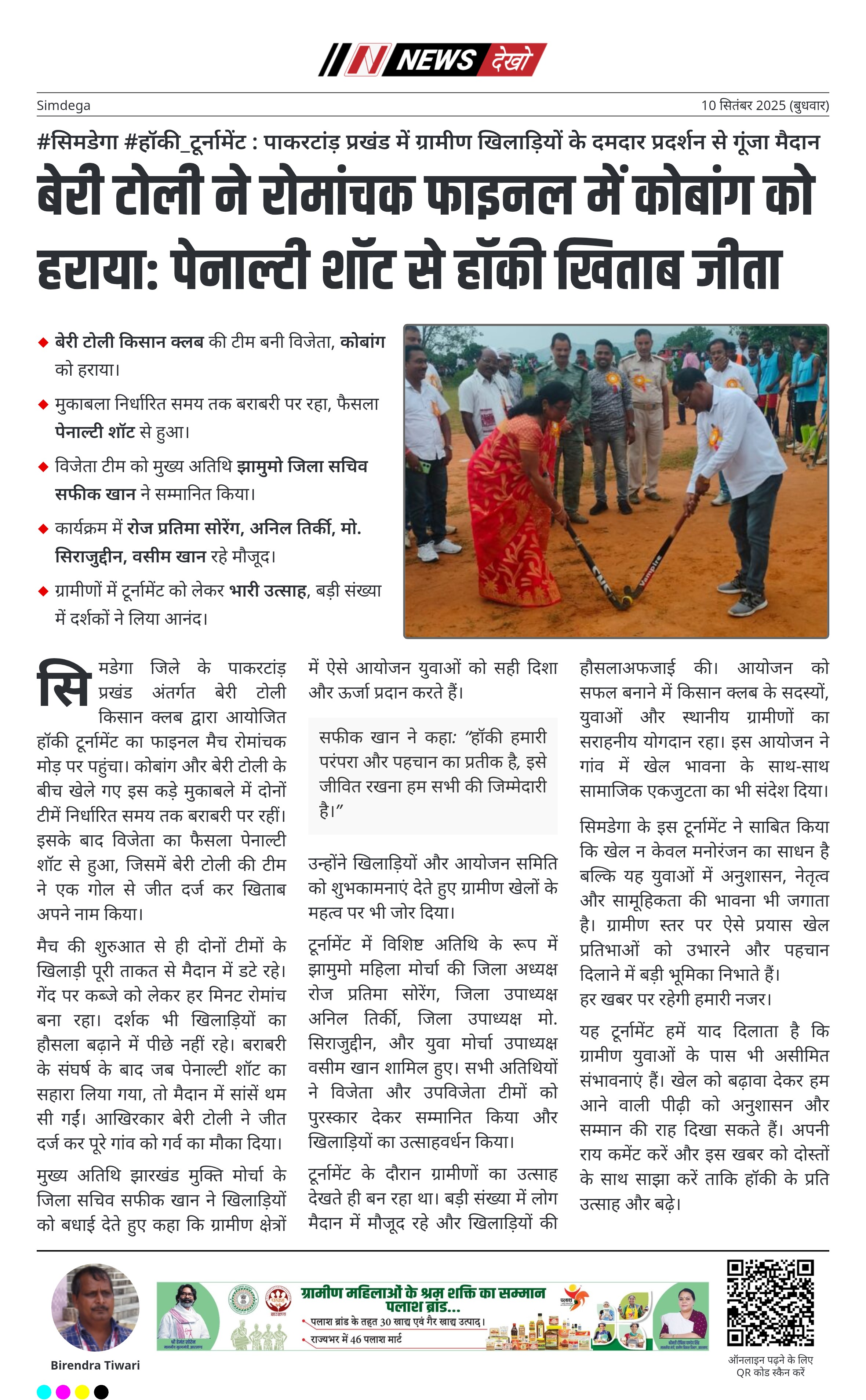 #सिमडेगा #हॉकी_टूर्नामेंट : पाकरटांड़ प्रखंड में ग्रामीण खिलाड़ियों के दमदार प्रदर्शन से गूंजा मैदान बेरी टोली किसान क्लब की टीम बनी विजेता, कोबांग को हराया। मुकाबला निर्धारित समय तक बराबरी पर रहा, फैसला पेनाल्टी शॉट से हुआ। विजेता टीम को मुख्य अतिथि झामुमो जिला सचिव सफीक खान ने सम्मानित किया।…