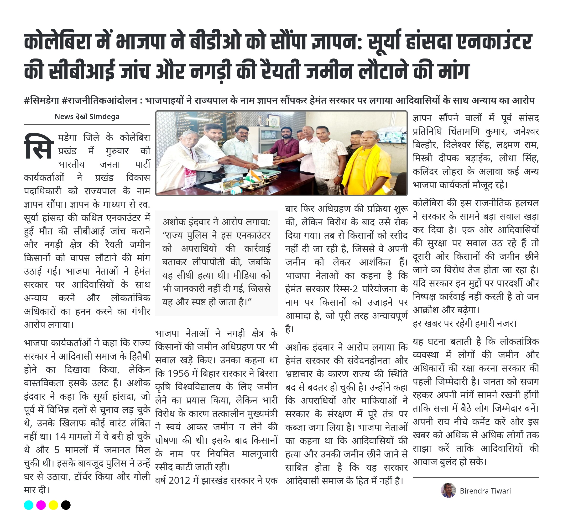 कोलेबिरा में भाजपा ने बीडीओ को सौंपा ज्ञापन: सूर्या हांसदा एनकाउंटर की सीबीआई जांच और नगड़ी की रैयती जमीन लौटाने की मांग