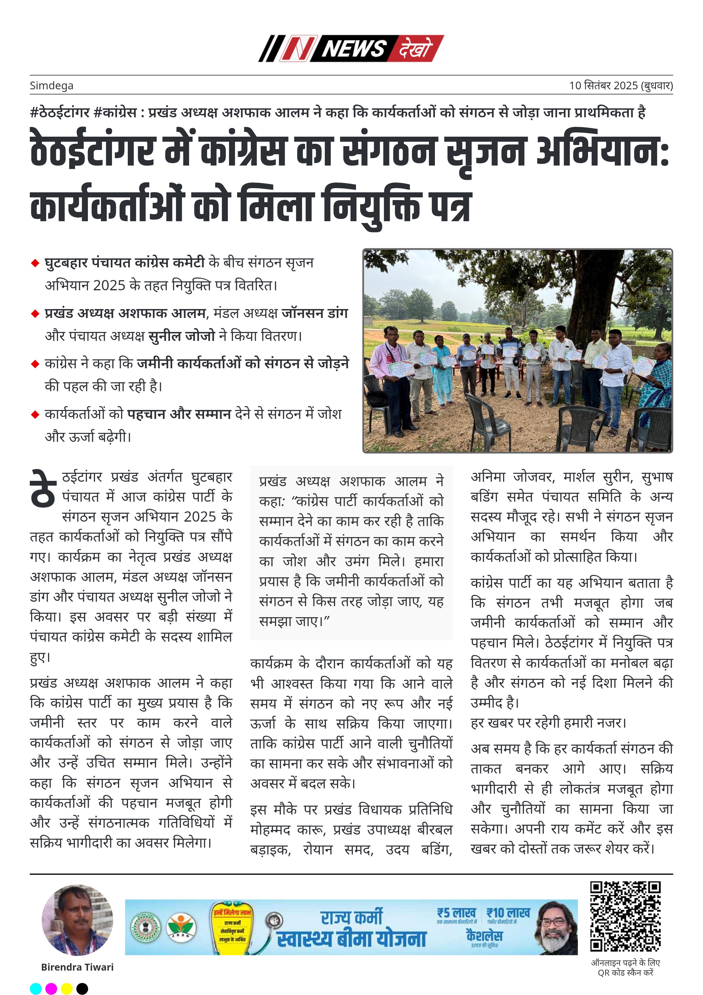सिमडेगा: बानो प्रखंड में पंचायत कांग्रेस कमेटियों को नियुक्ति पत्र सौंपे गए