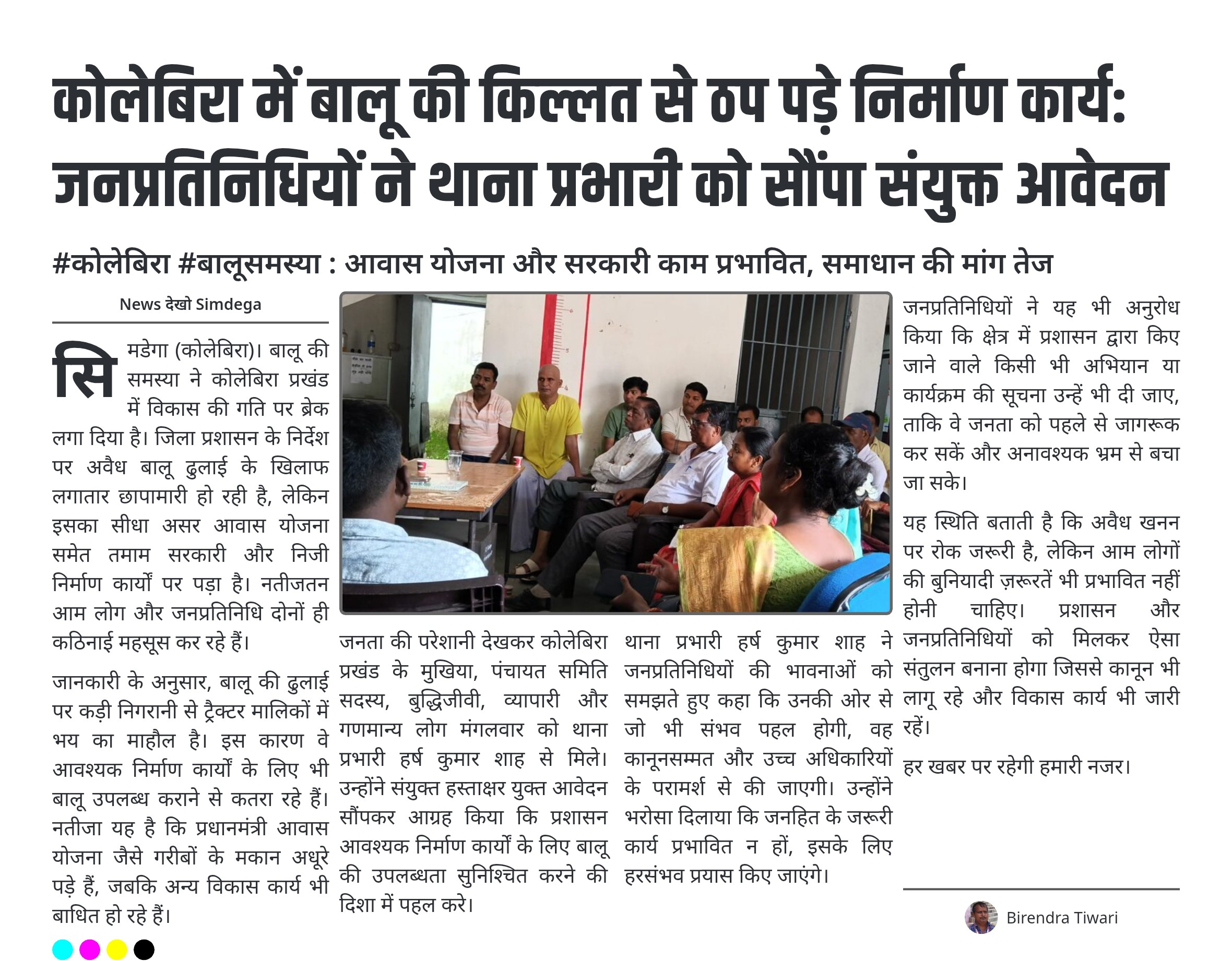 कोलेबिरा में बालू की किल्लत से ठप पड़े निर्माण कार्य: जनप्रतिनिधियों ने थाना प्रभारी को सौंपा संयुक्त आवेदन