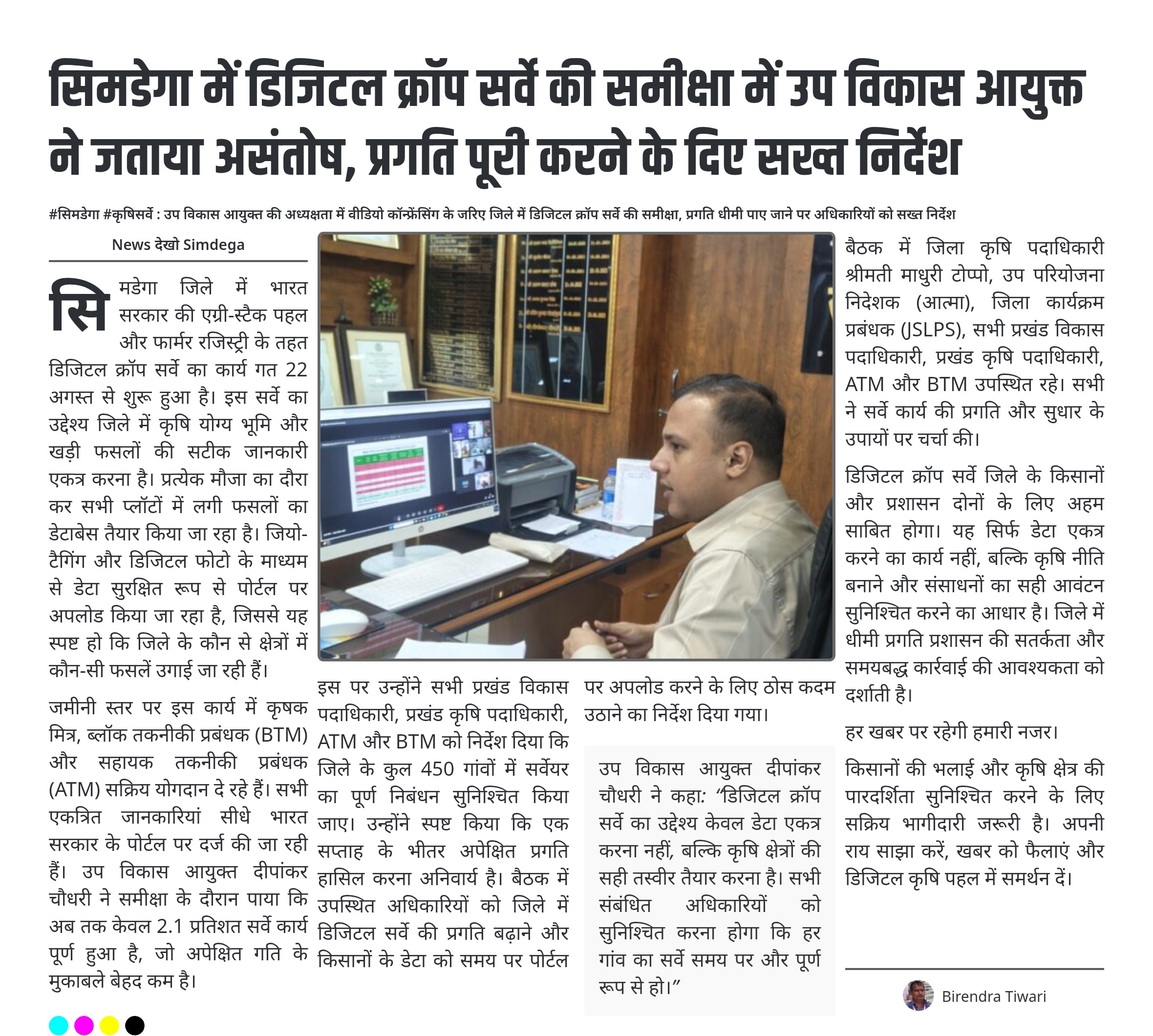 #सिमडेगा #कृषिसर्वे : उप विकास आयुक्त की अध्यक्षता में वीडियो कॉन्फ्रेंसिंग के जरिए जिले में डिजिटल क्रॉप सर्वे की समीक्षा, प्रगति धीमी पाए जाने पर अधिकारियों को सख्त निर्देश डिजिटल क्रॉप सर्वे 22 अगस्त 2025 से जिले के 450 गांवों में भारत सरकार के एग्री-स्टैक और फार्मर रजिस्ट्री प्रोजेक्ट के…