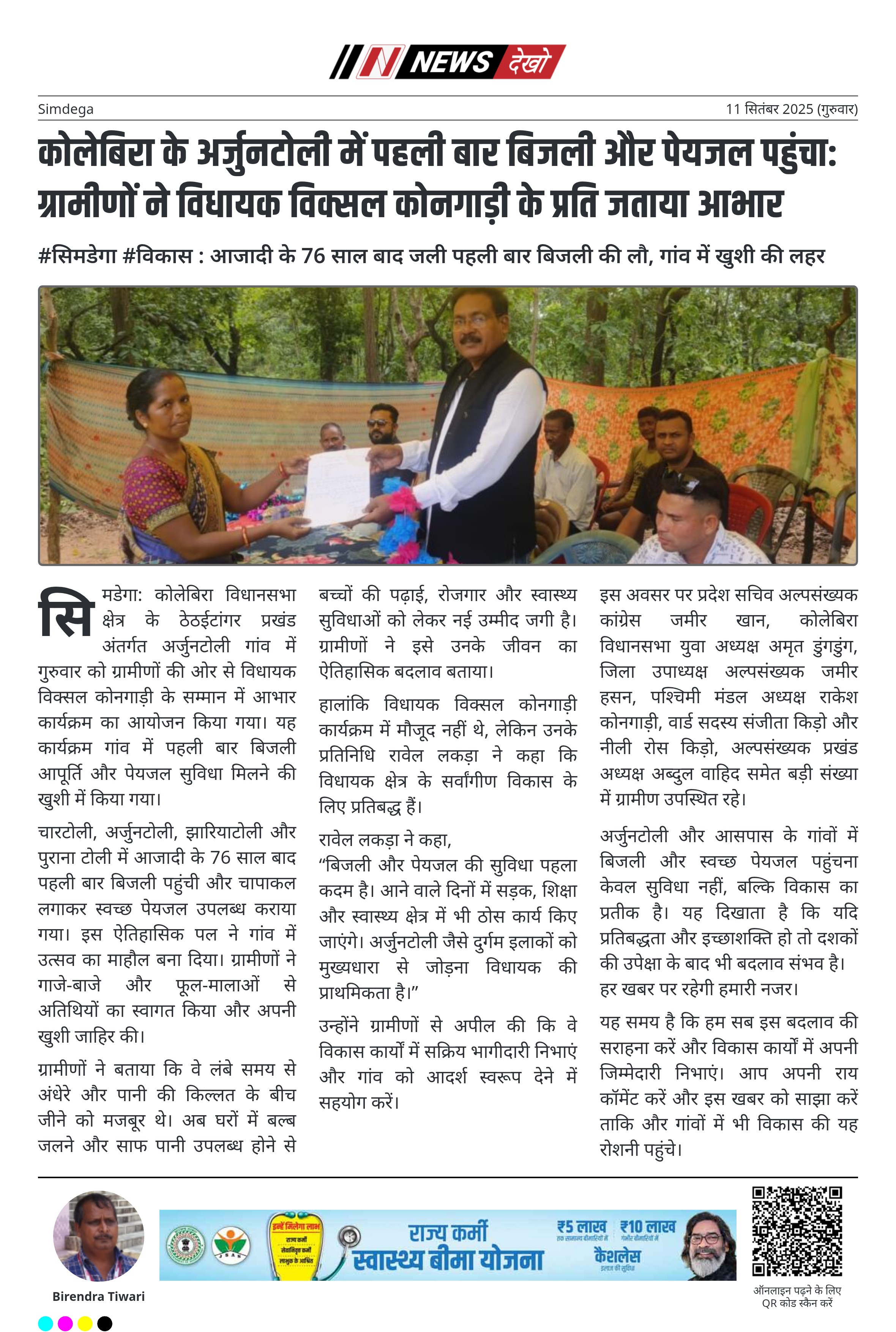 कोलेबिरा के अर्जुनटोली में पहली बार बिजली और पेयजल पहुंचा: ग्रामीणों ने विधायक विक्सल कोनगाड़ी के प्रति जताया आभार