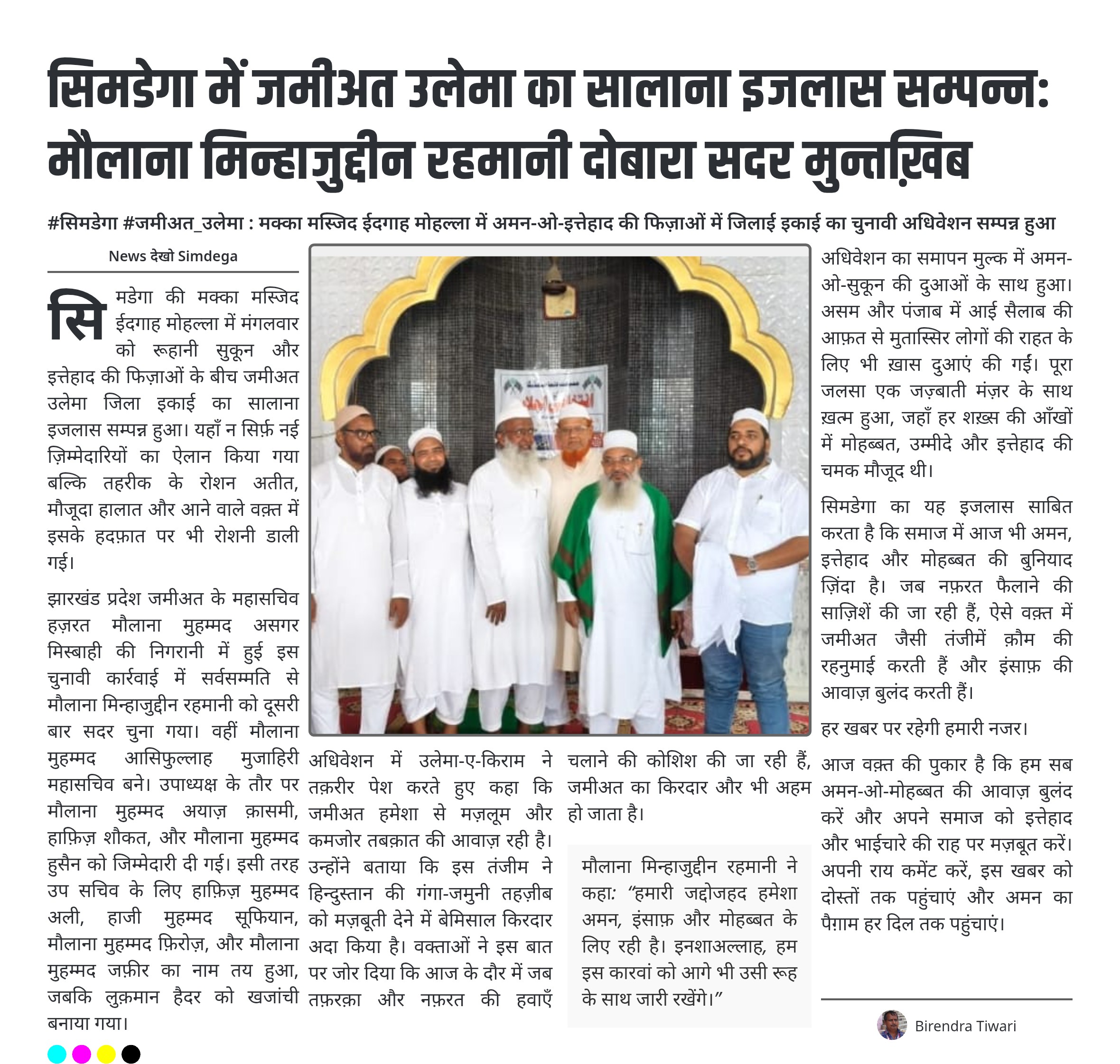 #सिमडेगा #जमीअत_उलेमा : मक्का मस्जिद ईदगाह मोहल्ला में अमन-ओ-इत्तेहाद की फिज़ाओं में जिलाई इकाई का चुनावी अधिवेशन सम्पन्न हुआ जमीअत उलेमा सिमडेगा का सालाना चुनावी इजलास मंगलवार को हुआ। सर्वसम्मति से मौलाना मिन्हाजुद्दीन रहमानी दोबारा सदर (अध्यक्ष) बने। मौलाना मुहम्मद आसिफुल्लाह मुजाहिरी महासचिव मुन्तख़िब हुए। पूरी चुनावी प्रक्रिया की निगरानी…