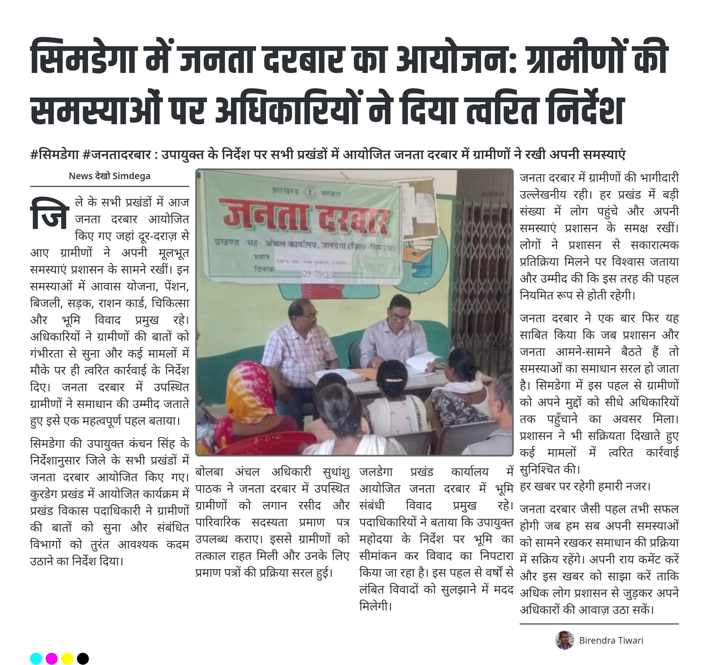 सिमडेगा में जनता दरबार का आयोजन: ग्रामीणों की समस्याओं पर अधिकारियों ने दिया त्वरित निर्देश