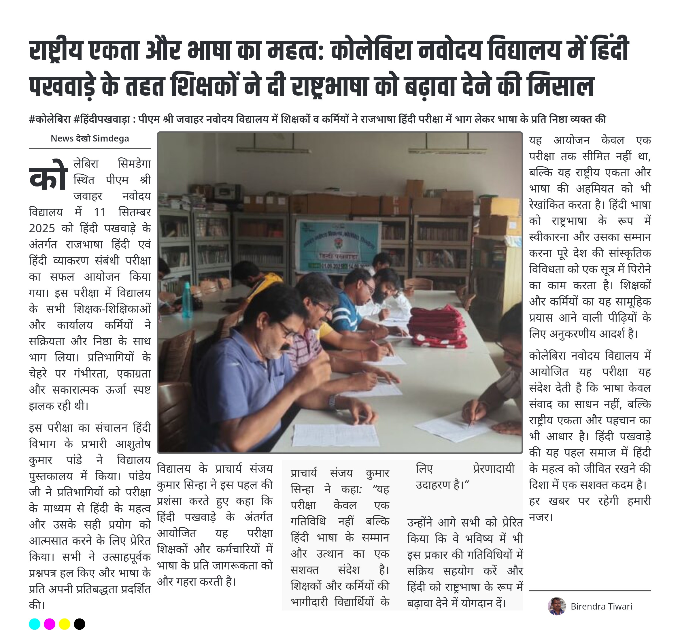 राष्ट्रीय एकता और भाषा का महत्व: कोलेबिरा नवोदय विद्यालय में हिंदी पखवाड़े के तहत शिक्षकों ने दी राष्ट्रभाषा को बढ़ावा देने की मिसाल