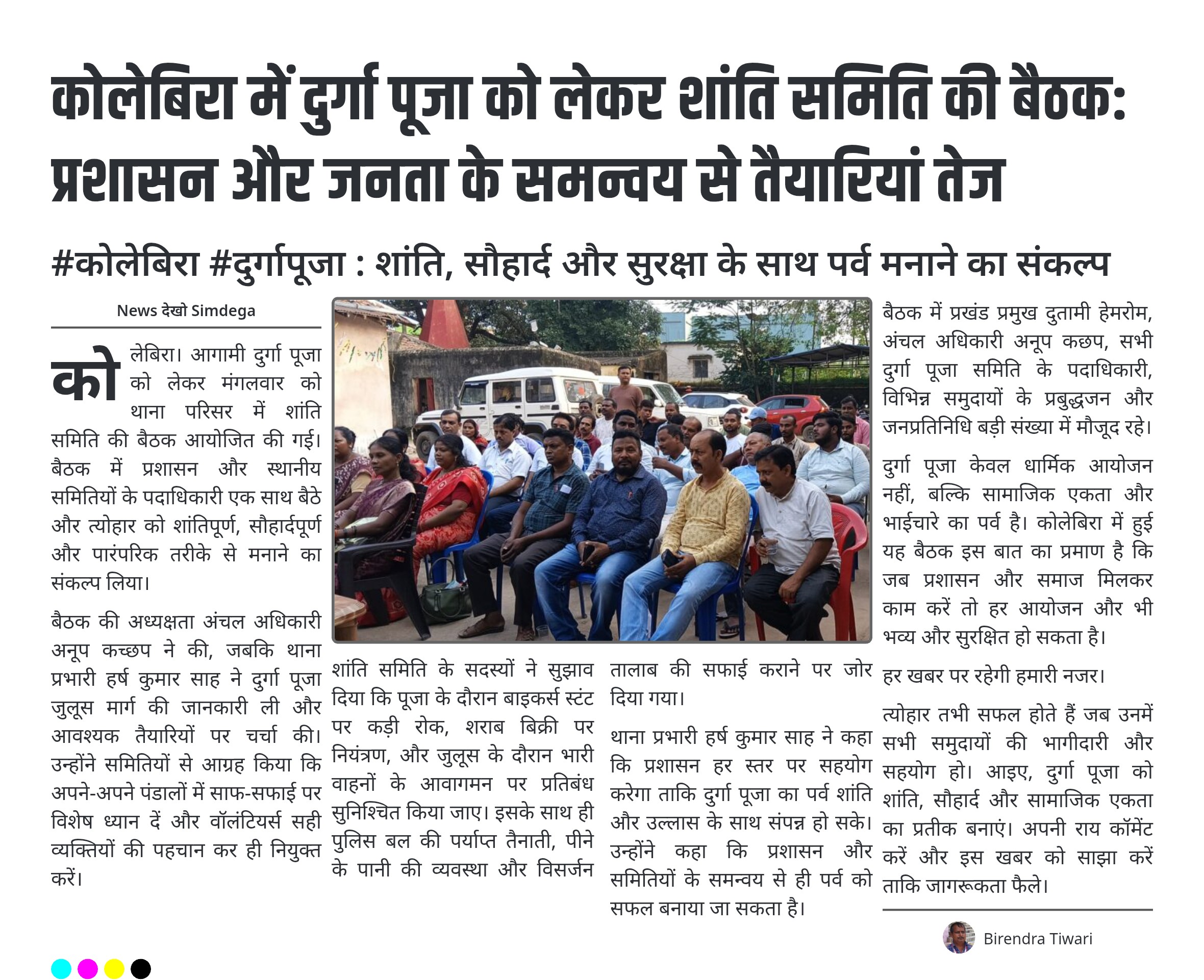 #कोलेबिरा #दुर्गापूजा : शांति, सौहार्द और सुरक्षा के साथ पर्व मनाने का संकल्प कोलेबिरा थाना परिसर में दुर्गा पूजा को लेकर शांति समिति की बैठक हुई। बैठक की अध्यक्षता अंचल अधिकारी अनूप कच्छप ने की। थाना प्रभारी हर्ष कुमार साह ने जुलूस मार्ग और तैयारियों पर चर्चा की। समितियों को…