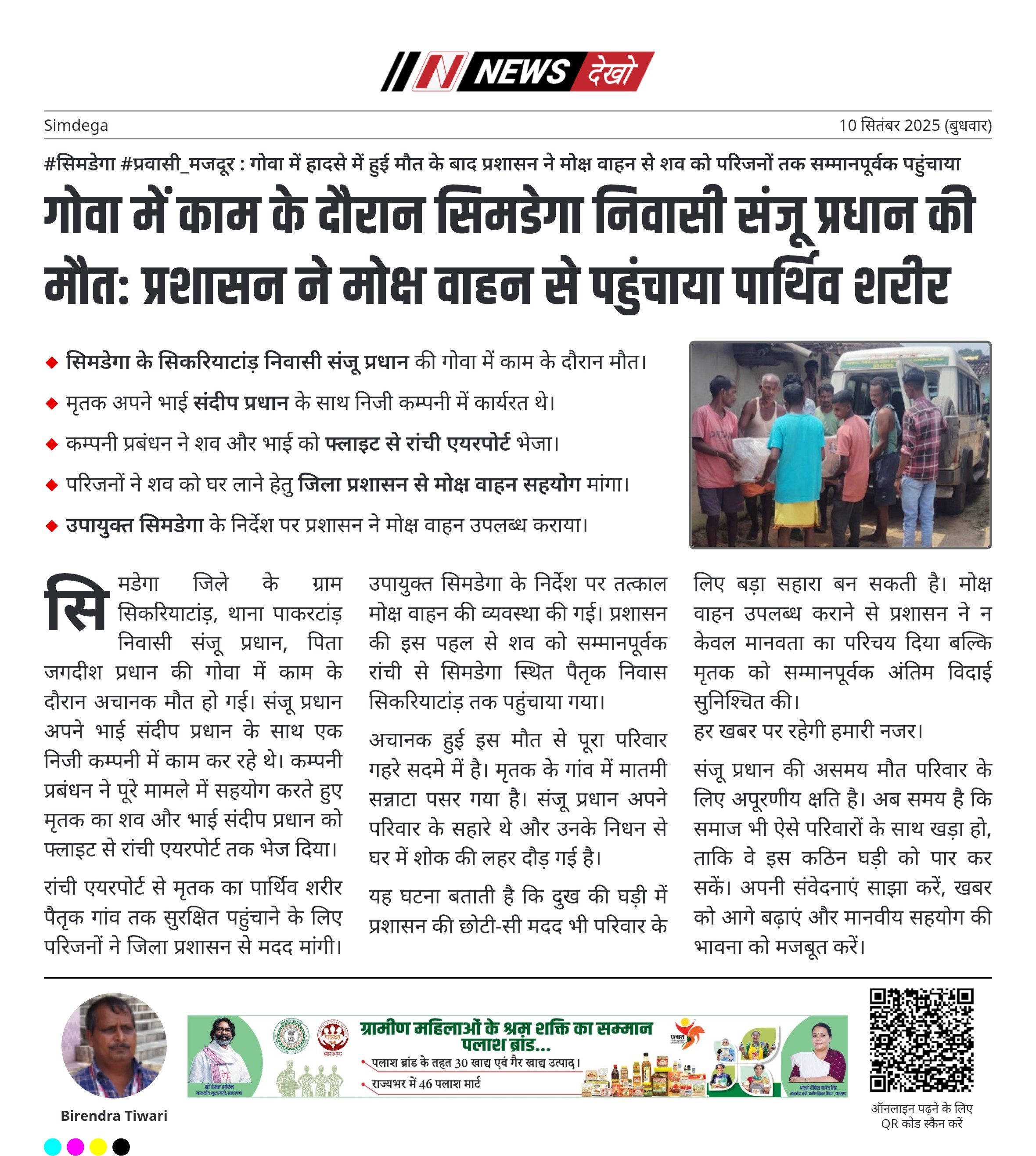 #सिमडेगा #प्रवासी_मजदूर : गोवा में हादसे में हुई मौत के बाद प्रशासन ने मोक्ष वाहन से शव को परिजनों तक सम्मानपूर्वक पहुंचाया सिमडेगा के सिकरियाटांड़ निवासी संजू प्रधान की गोवा में काम के दौरान मौत। मृतक अपने भाई संदीप प्रधान के साथ निजी कम्पनी में कार्यरत थे। कम्पनी प्रबंधन ने…