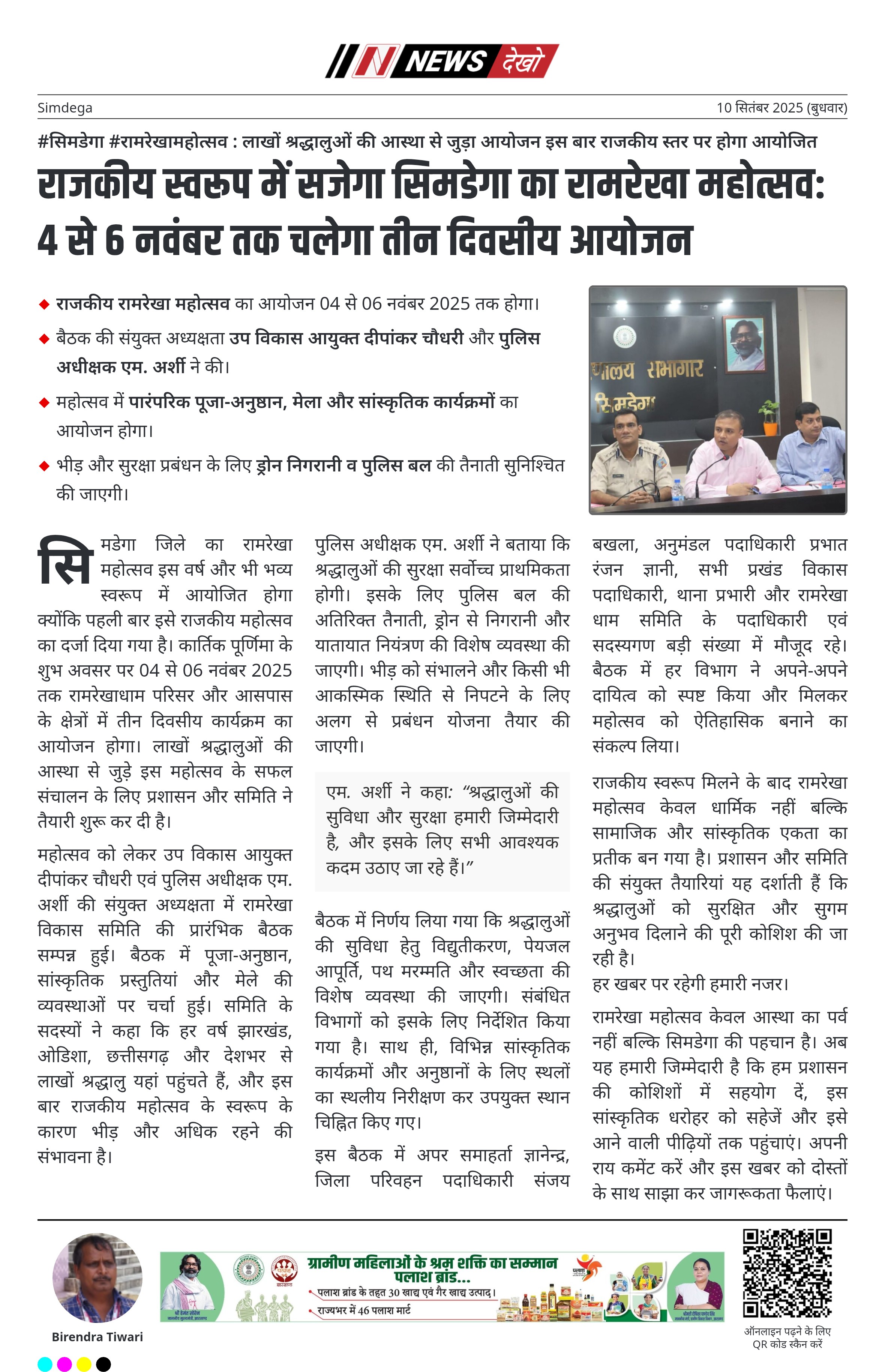 #सिमडेगा #रामरेखामहोत्सव : लाखों श्रद्धालुओं की आस्था से जुड़ा आयोजन इस बार राजकीय स्तर पर होगा आयोजित राजकीय रामरेखा महोत्सव का आयोजन 04 से 06 नवंबर 2025 तक होगा। बैठक की संयुक्त अध्यक्षता उप विकास आयुक्त दीपांकर चौधरी और पुलिस अधीक्षक एम. अर्शी ने की। महोत्सव में पारंपरिक पूजा-अनुष्ठान, मेला…
