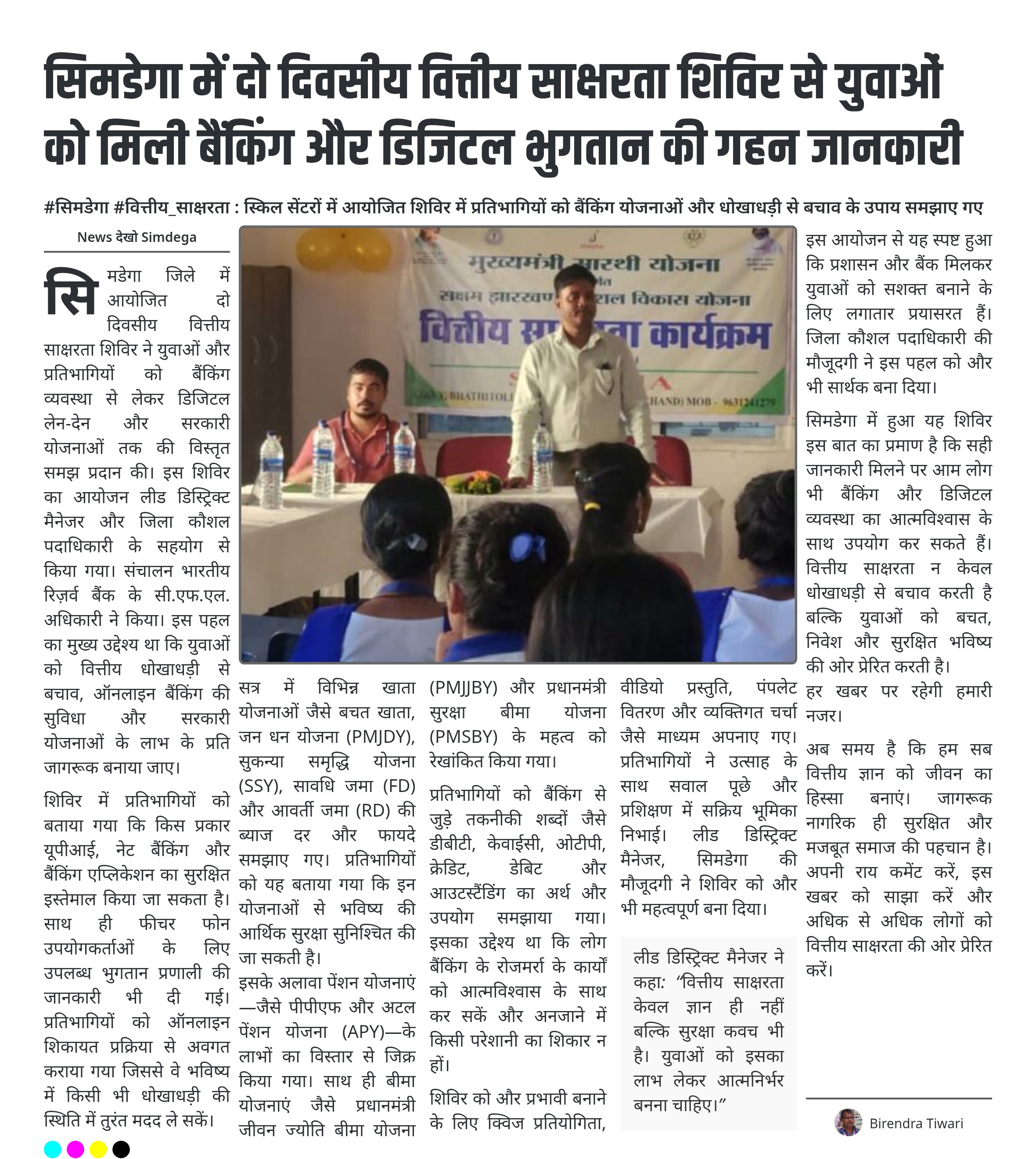 #सिमडेगा #वित्तीय_साक्षरता : स्किल सेंटरों में आयोजित शिविर में प्रतिभागियों को बैंकिंग योजनाओं और धोखाधड़ी से बचाव के उपाय समझाए गए Excel Data Services स्किल सेंटर और SHIKSHA स्किल सेंटर में दो दिवसीय शिविर संपन्न। आयोजन में लीड डिस्ट्रिक्ट मैनेजर, सिमडेगा और जिला कौशल पदाधिकारी का सहयोग। संचालन भारतीय रिज़र्व…