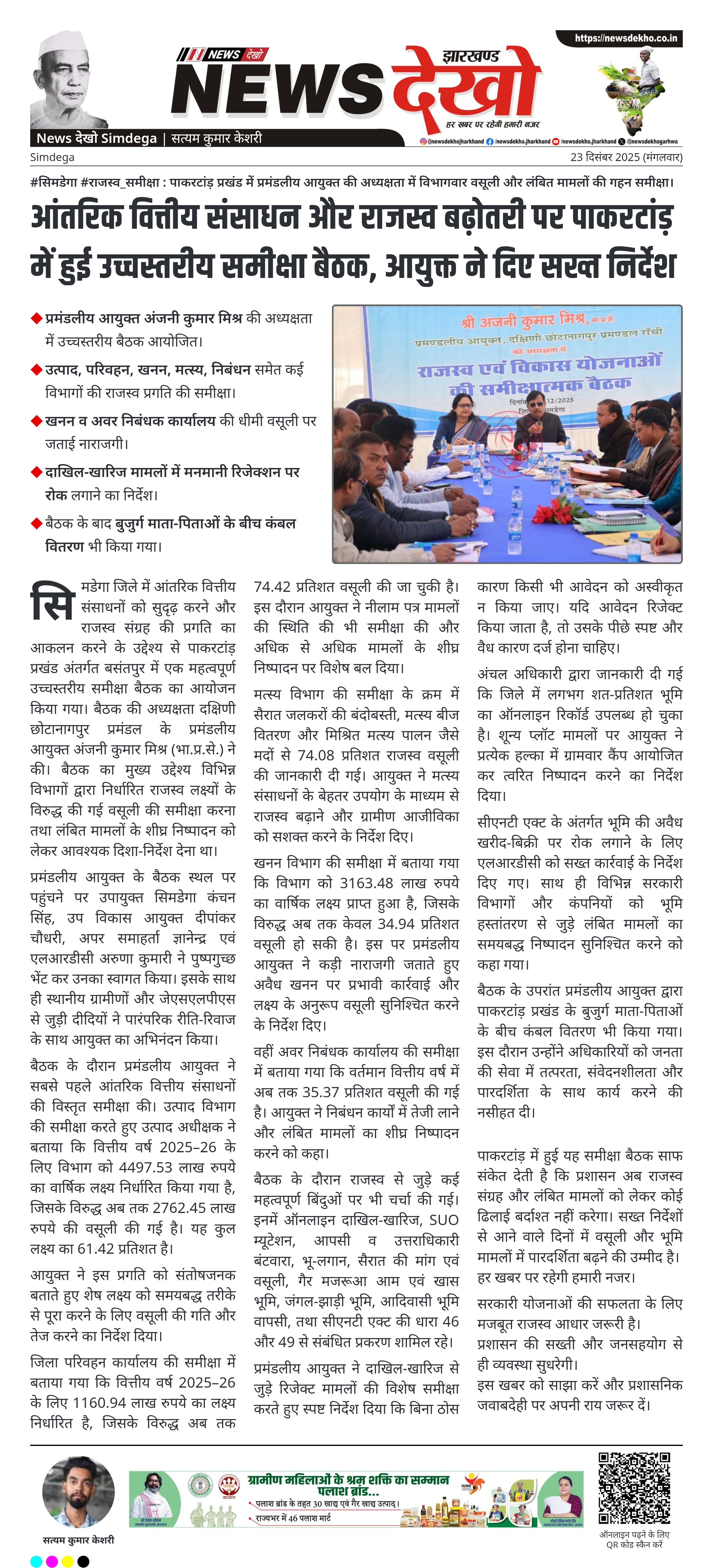 #सिमडेगा #राजस्व_समीक्षा : पाकरटांड़ प्रखंड में प्रमंडलीय आयुक्त की अध्यक्षता में विभागवार वसूली और लंबित मामलों की गहन समीक्षा। प्रमंडलीय आयुक्त अंजनी कुमार मिश्र की अध्यक्षता में उच्चस्तरीय बैठक आयोजित। उत्पाद, परिवहन, खनन, मत्स्य, निबंधन समेत कई विभागों की राजस्व प्रगति की समीक्षा। खनन व अवर निबंधक कार्यालय की धीमी…