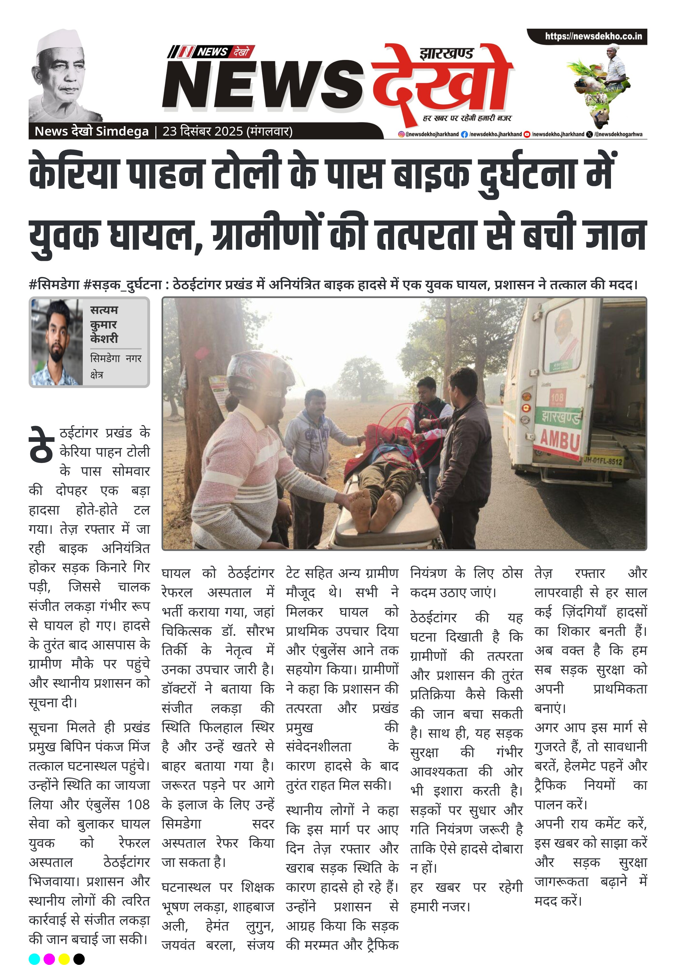 #सिमडेगा #सड़क_दुर्घटना : ठेठईटांगर प्रखंड में अनियंत्रित बाइक हादसे में एक युवक घायल, प्रशासन ने तत्काल की मदद। केरिया पंचायत के पाहन टोली के पास बाइक अनियंत्रित होकर दुर्घटनाग्रस्त। संजीत लकड़ा, निवासी कुड़पानी, हादसे में हुए घायल। प्रखंड प्रमुख बिपिन पंकज मिंज मौके पर पहुंचकर की त्वरित कार्रवाई। एंबुलेंस 108…